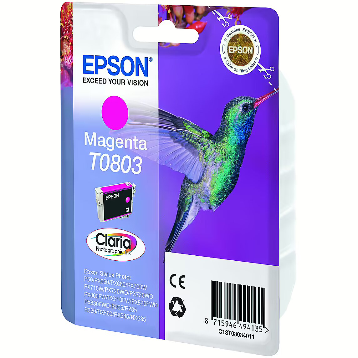LongSummaryDescription - Epson Hummingbird Singlepack Magenta T0803 Claria Photographic Ink. Colour ink type: Pigment-based ink, Colour ink volume: 7.4 ml, Printing colours: Magenta, Quantity per pack: 1 pc(s)