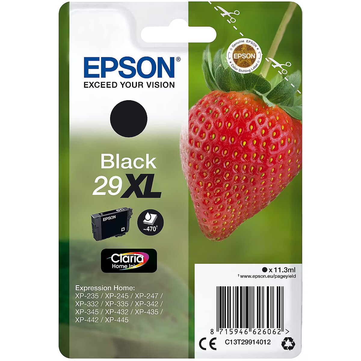 LongSummaryDescription - Epson Strawberry Singlepack Black 29XL Claria Home Ink. Cartridge capacity: High (XL) Yield, Black ink type: Pigment-based ink, Black ink volume: 11.3 ml, Printing colours: Black, Quantity per pack: 1 pc(s), Black ink page yield: 470 pages