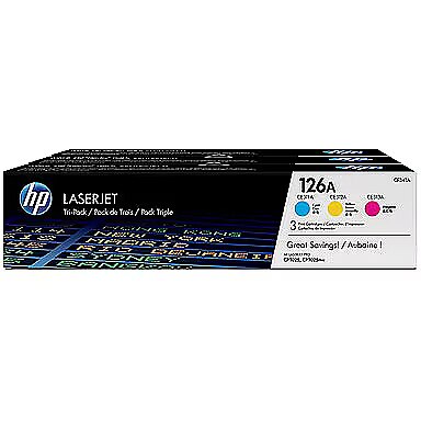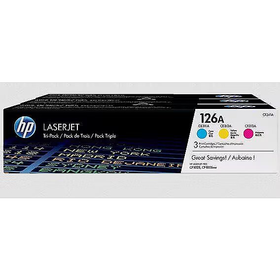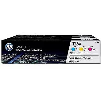 LongDesc - Ideal for value-conscious customers who want to save on professional-quality colour documents.HP 126A Cyan/Magenta/Yellow Tri-pack LaserJet Toner Cartridges offer professional print quality and better value than individual cartridges. Purchase three colour toner cartridges packaged together and print rich colour with HP Colorsphere technology