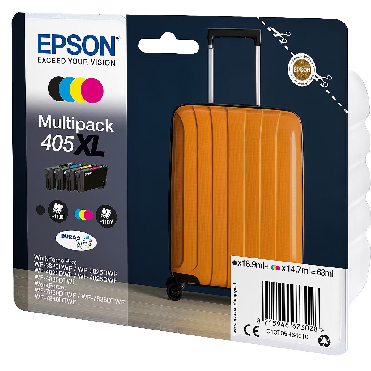 Technical_details - Ink Multipack 405XL (C13T05H64010) The ink multipack 405XL (C13T05H64010) is suitable for inkjet printers from Epson's WorkForce series. This set of four original Durabrite Ultra series ink cartridges contains one 18.9 ml black ink cartridge and one each of 14.7 ml cyan, magenta and yellow ink. The range of the cartridges is 1100 pages each (ISO) Type: Ink EAN code: 8715946673028 Manufacturer No.: C13T05H64010 Series: Durabrite Ultra Printing color: cyan, yellow, magenta, black Good For: Manufacturers | Epson Suitable for: model | WorkForce Pro WF-4830DTWF, WorkForce Pro WF-4825DWF, WorkForce Pro WF-4820DWF, WorkForce Pro WF-3825DWF, WorkForce Pro WF-3820DWF, WorkForce WF-7830DTWF, WorkForce WF-7835DTWF, WorkForce WF-7840DTWF Consumption: volume | 63ml (1x 18.9ml, 3x 14.7ml) Usage: Black | ISO: 1100 pages Usage: Color | ISO: 1100 pages