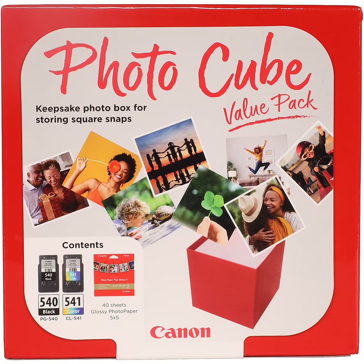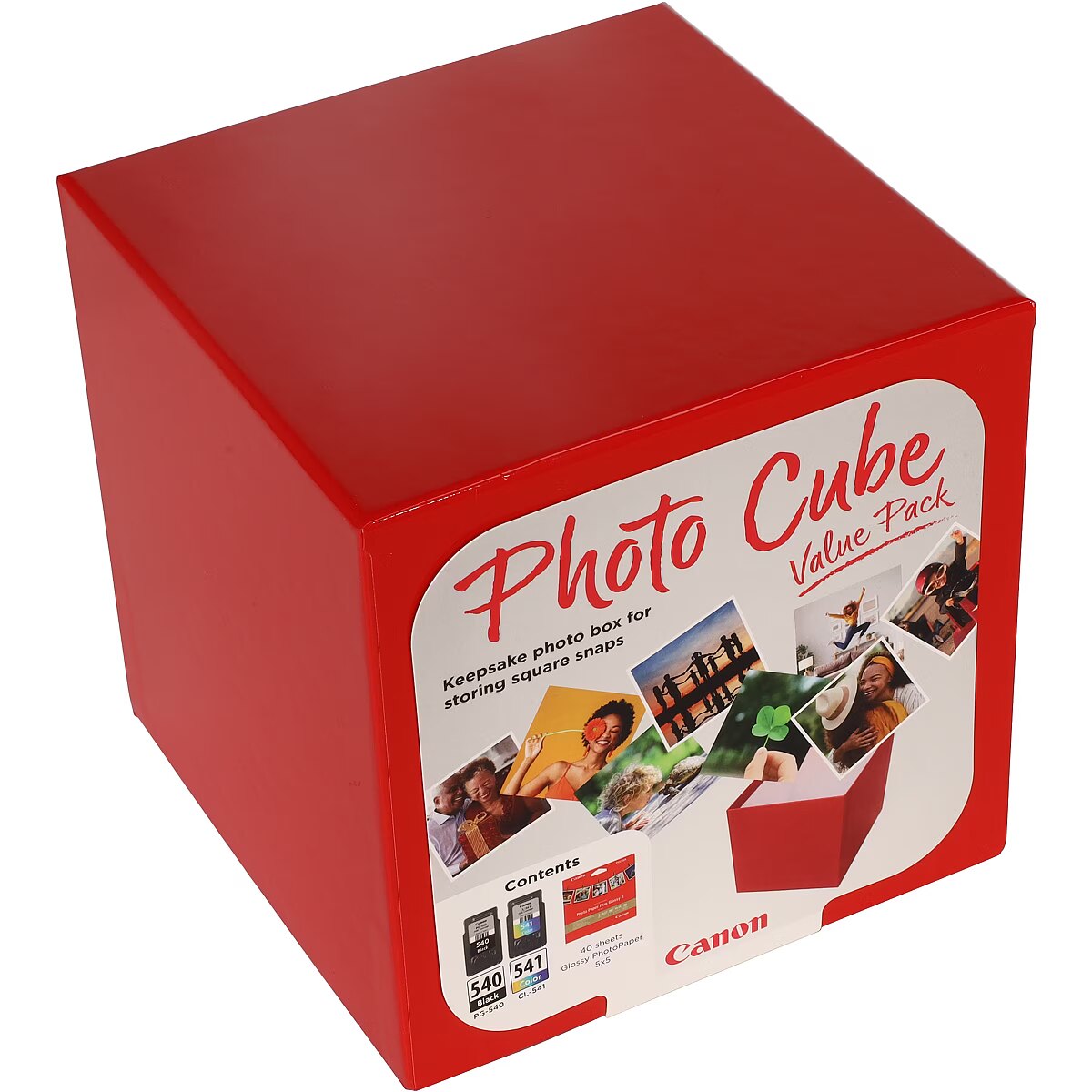 LongDesc - The Photo Cube is a great way to keep your photos safe. Small enough to store around your home, it is a perfect way to store your most precious photos or give to friends and family as a gift. The red box measures 14 x 14 x 14cm (approximate), allowing for plenty of space to store printed images. Square photo printing is popular among young people and families, as the social media friendly format allows for more creative printing. This pack is perfect for social media printing, coming with Genuine Canon PG-540 Black Ink Cartridges, CL-541 C/M/Y Colour Ink Cartridges and 40 5x5” sheets of square Photo Paper Plus Glossy II, allowing you to get more creative with your printing.