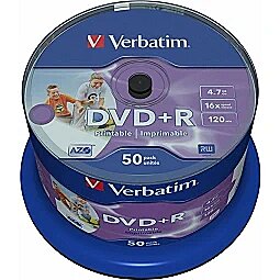 LongSummaryDescription - Verbatim DVD+R Wide Inkjet Printable No ID Brand. Native capacity: 4.7 GB, Type: DVD+R, Quantity per pack: 50 pc(s). Package type: Spindle. DVD write speed: 16x