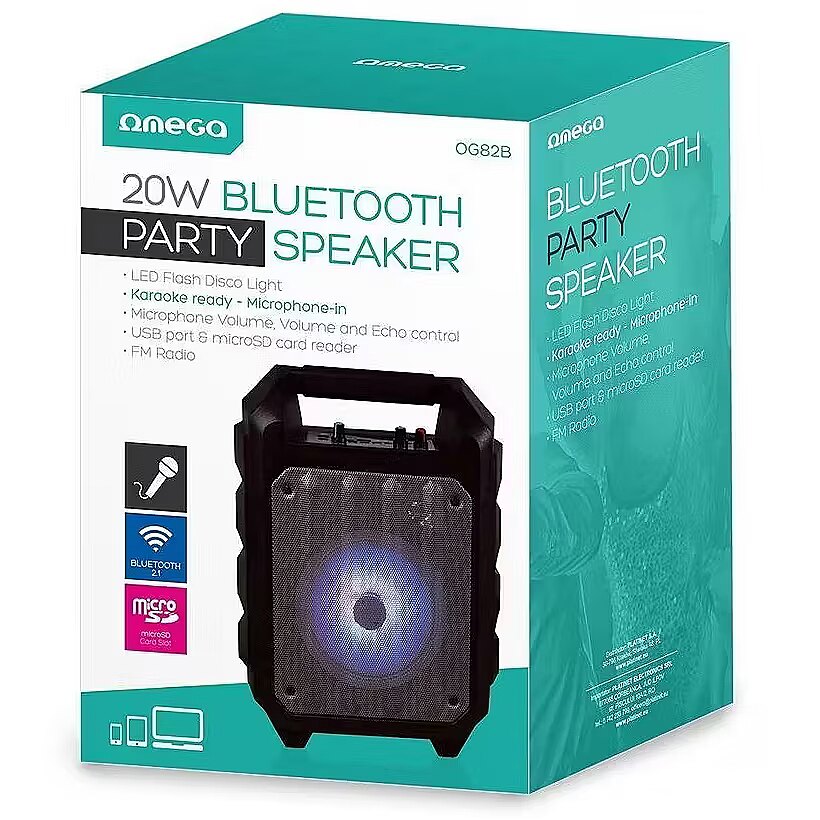 Omega OG82B kõlar on varustatud värvilise LED valgustusega, mis koos esitatava muusikaga helendab. Sisseehitatud 3000 mAh aku võimaldab asetada kõlari kõikjale – ilma kaabliteta või pistikupesa otsimata. Integreeritud mugav käepide võimaldab kõlarit mugavalt kõikjale kaasas kanda.