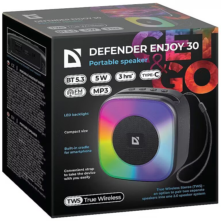 Description - Defender Enjoy 30 BLUETOOTH 5W Speaker. Portable speaker. Portable Bluetooth speaker with LED backlight, built-in MP3 player and FM tuner. Support for flash drives and microSD memory cards.