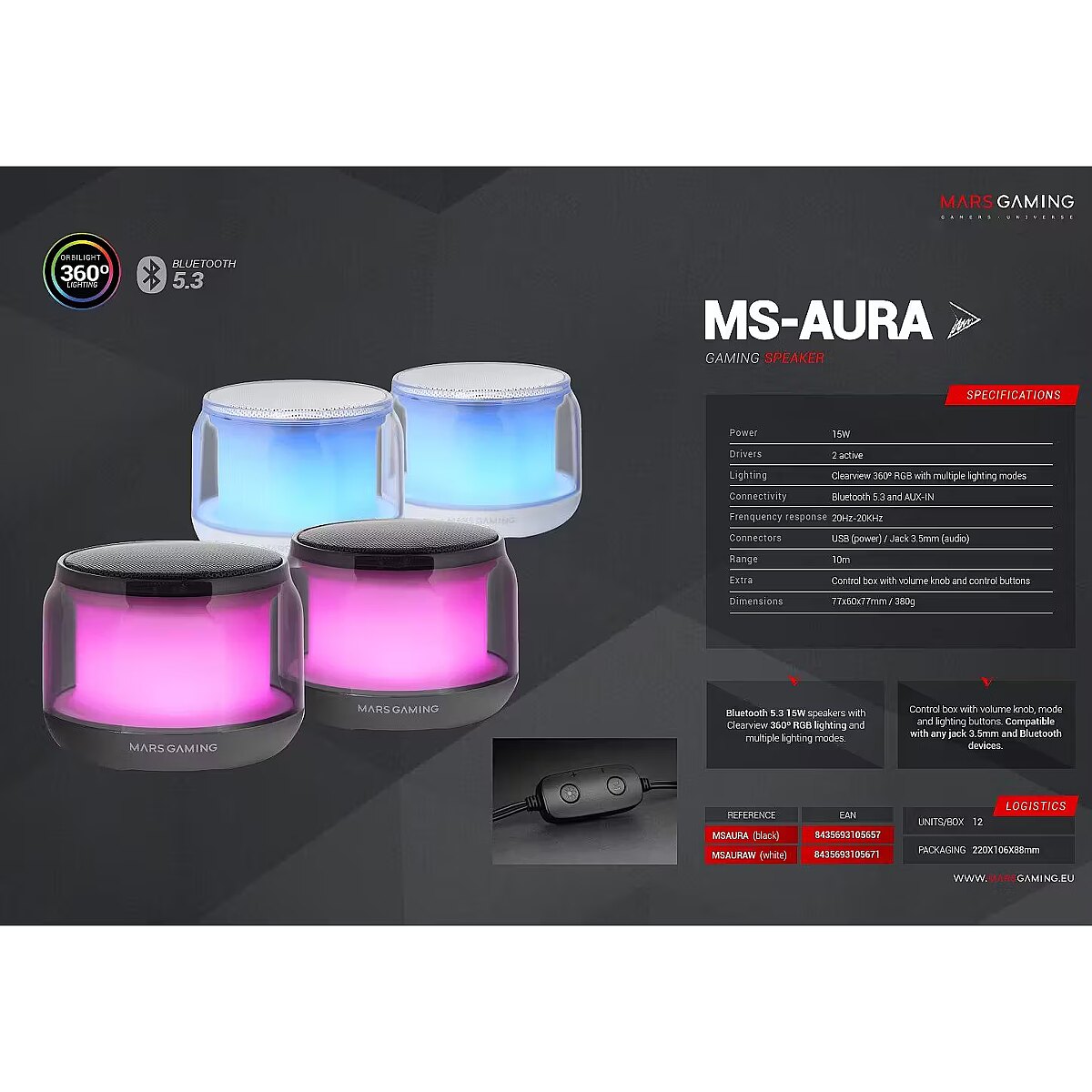 LongDesc - Transform any space with the MS-AURA ClearView 360º RGB Bluetooth speakers, designed to offer superior performance and an aesthetic that adapts to any environment. With 15W of power and a custom DSP processor, Bluetooth 5.3 connection + Jack connectivity, and a volume control box, connection mode and lighting, these speakers are the perfect choice for those looking for quality, style and versatility.Compact RGB 360º designFeaturing a compact and modern design with 360º RGB lighting, the MS-AURA Bluetooth speakers are the perfect addition to your setup. Their mini size allows for easy integration into any desktop or gaming area, adding a touch of style without compromising performance.Available in 2 versionsBlack and whiteChoose the one that best suits your setupVersatile connectivityEquipped with Bluetooth 5.3, AUX-IN input, and USB power, the MS-AURA offers wide and versatile connectivity. Connect them to your smartphone, tablet or computer and enjoy a stable, high-quality connection. Enjoy your music and sound effects without interruptions, always keeping your focus on what matters most.Total control at your fingertipsThe MS-AURA control box allows for easy and intuitive operation. Choose between aux-in or Bluetooth mode, adjust the volume or change lighting modes with the push of a button.Power and sound qualityWith 15W of power and a custom DSP chipset, the MS-AURA speakers deliver exceptional sound quality that will transform your gaming experience. Immerse yourself in your favorite games and music with unparalleled clarity and depth, and enjoy every detail like never before. Ideal for music, games, and movies, the MS-AURA speakers deliver a full, immersive experience.Clearview 360º RGB lightingElevate your space with the MS-AURA's stunning ClearView 360° RGB lighting. With multiple lighting modes, you can customize the ambiance to suit your mood or activity. Perfect for late-night gaming sessions or parties with friends, these speakers deliver powerful sound and an immersive atmosphere that completes your setup.