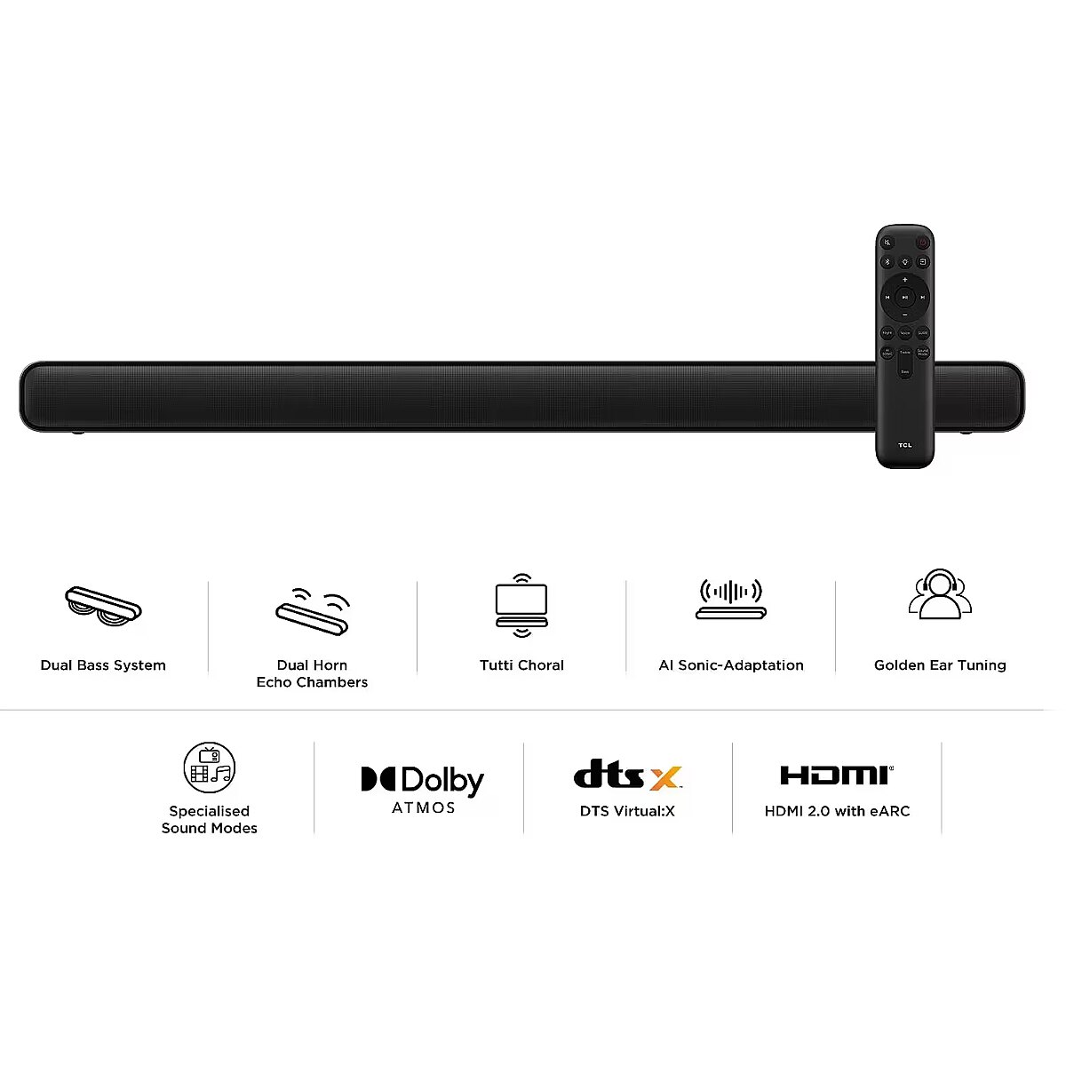 Summary - TCL S S45H Class 2.0 Channel Sound Bar with Dolby Atmos, DTS Virtual:X, and Bluetooth Music Streaming. Audio output channels: 2.0 channels, RMS rated power: 50 W, Audio decoders: DTS:X, Dolby Atmos, Dolby Digital Plus, Dolby MAT, Dolby Surround, Dolby TrueHD. Soundbar speaker RMS power: 40 W. Subwoofer location: Built-in. Product colour: Titanium, Colour name: Dark titanium, Display type: LED. Connectivity technology: Wired & Wireless, Bluetooth codec: A2DP, AVRCP, SBC