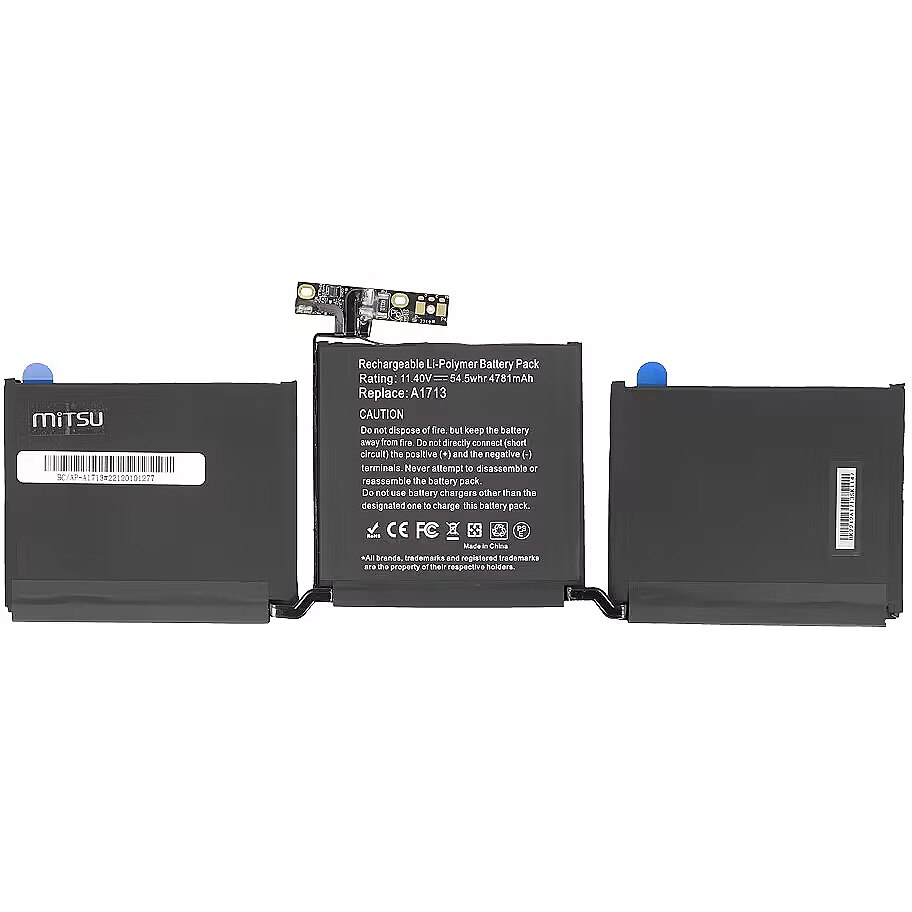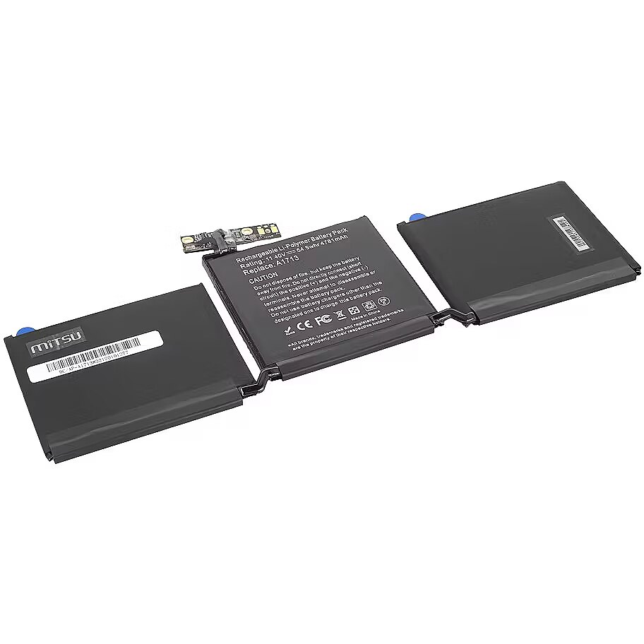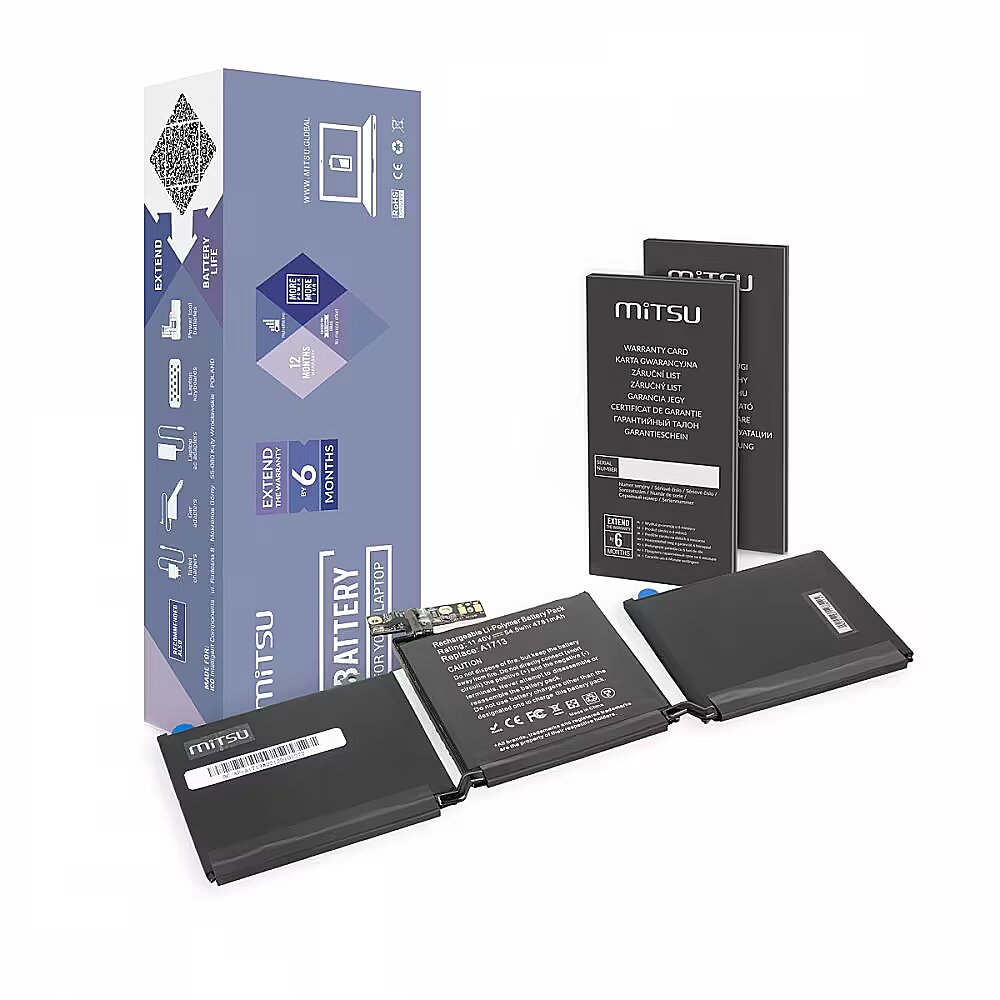 Description - BC/AP-A1713 High quality at a reasonable price, safety and ecology are the features of MITSU batteries that have already been appreciated by thousands of Europeans, mainly in Poland, the Czech Republic and Slovakia. It is the result of combining the best components with attention to every stage of the production process, supported by constant quality control and emphasis on the safety of the device. MITSU is: High-class, proven, ecological class A lithium-ion cells, Actual declared capacity, Much slower decline in nominal capacity compared to other cheaper substitutes, Low susceptibility to spontaneous discharge, No memory effect, Factory protection against overcharging and deep discharge, as well as against OVP overvoltage, OTP overheating, SCP short circuit and OCP current overload, Reliable and long-lasting time between charging cycles, 6-step quality control. By purchasing this laptop battery, you can also be sure that you are caring for the natural environment. The manufacturer cooperates closely with organizations dealing with broadly understood ecological education, supporting selective collection and maximum waste recovery. MITSU batteries are products with CE, ROHS and ISO9001 certificates.