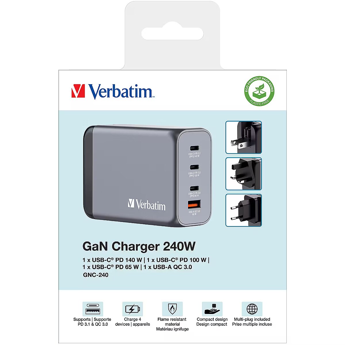 LongDesc - 240W 4-in-1 ChargingVerbatim’s 140W GaN Wall Charger combines two USB-C PD 140W ports, one USB-C PD 20W port and one USB-A QC 3.0 port in a sleek, palm sized design. Ideal for the office, home or travelling to power your laptop, tablet, smartphone, gaming devices, and more. With its foldable US prongs and replaceable EU and UK plugs, it’s the ultimate travel companion.Safe and ReliableThe GaN charger is made with high-quality, flame-resistant materials and features four safety protection systems, including over-current protection, over-voltage protection, short circuit protection, and over-temperature protection to ensure your safety while charging.