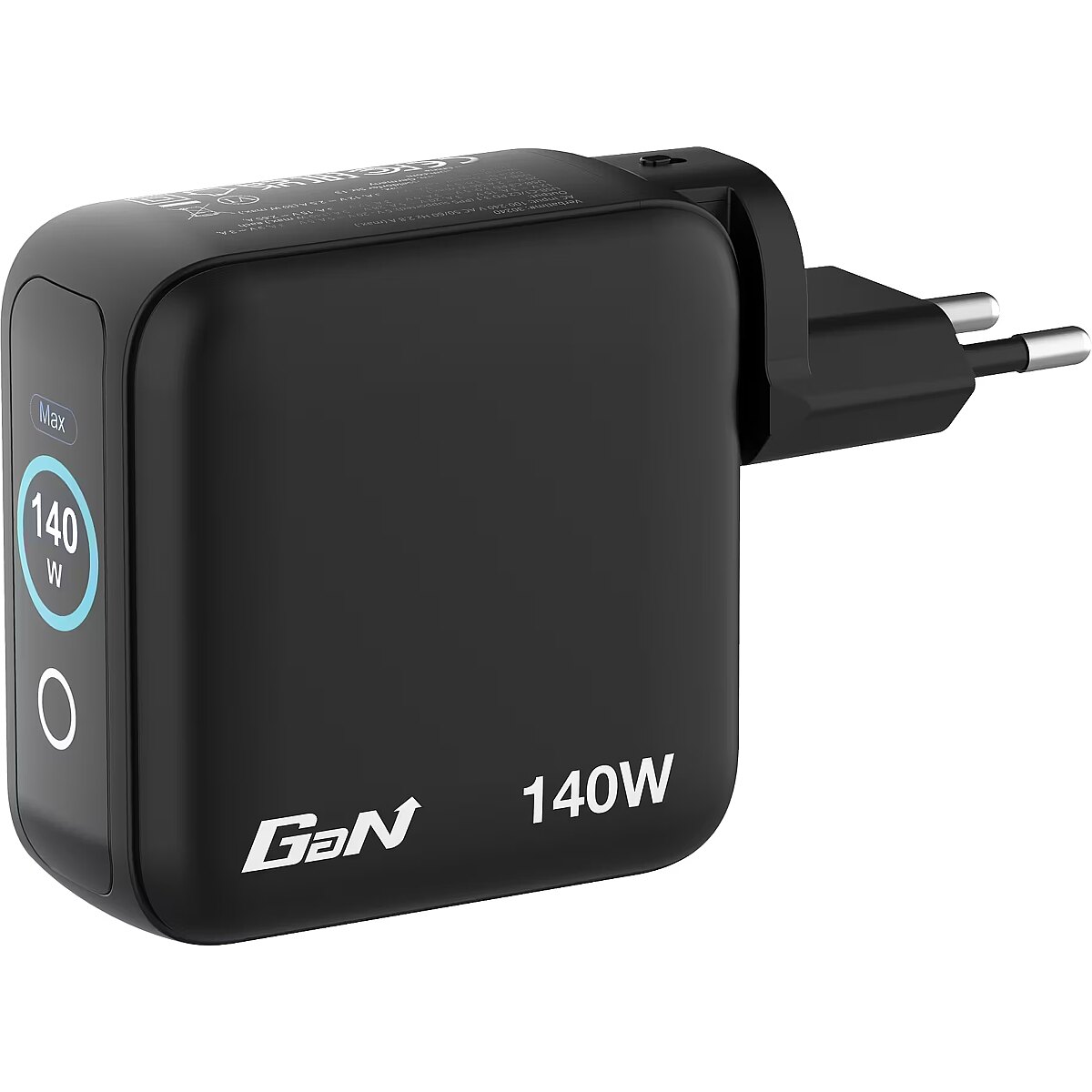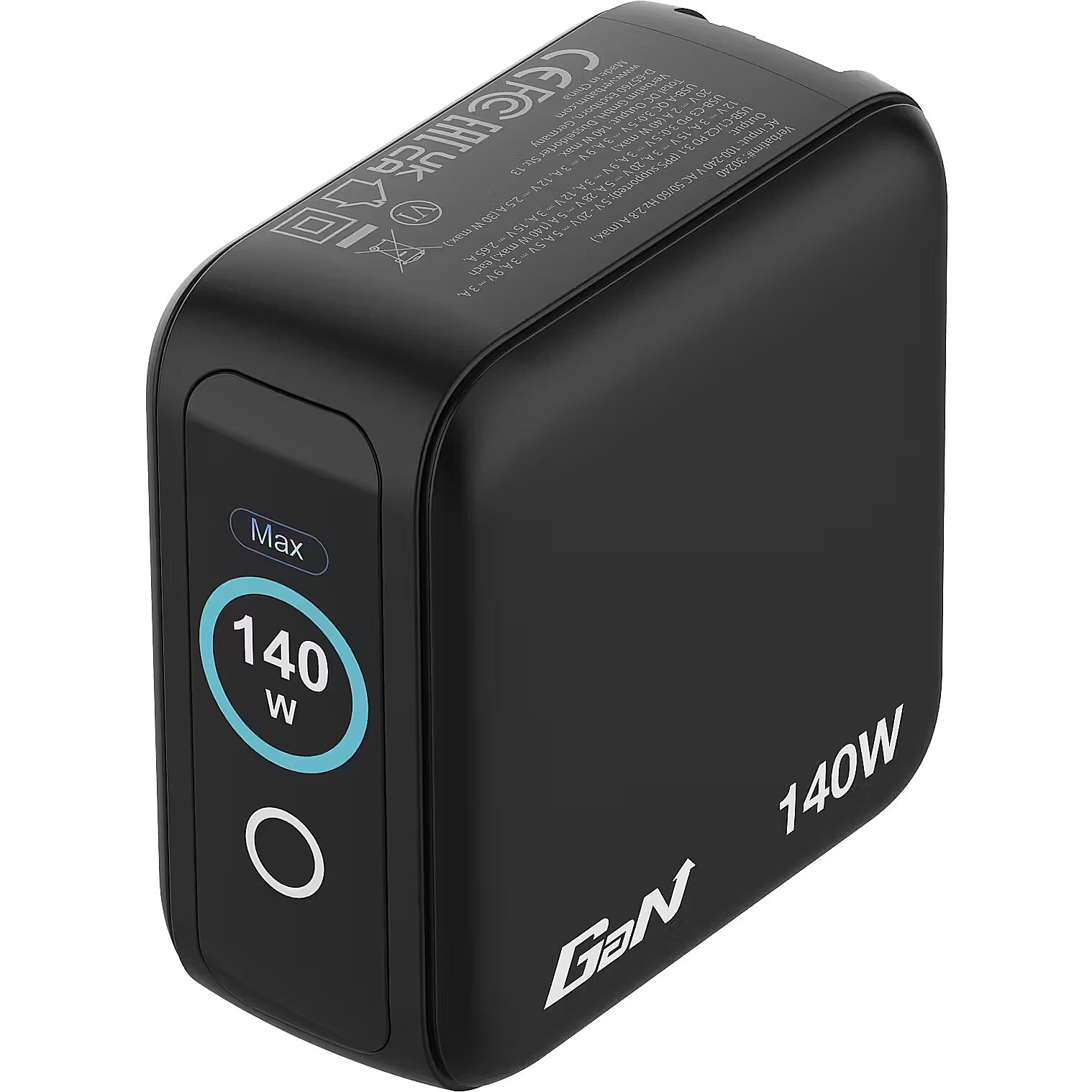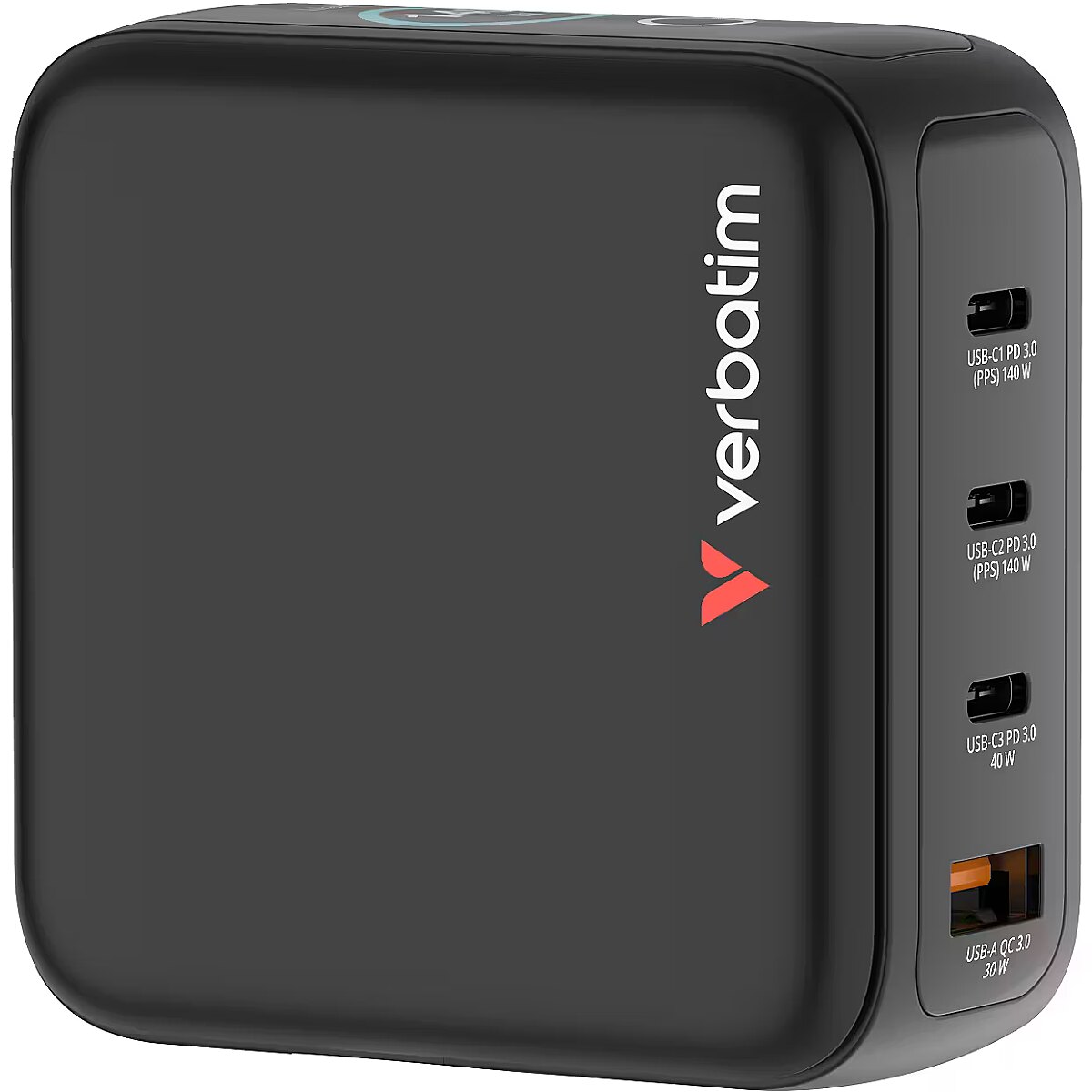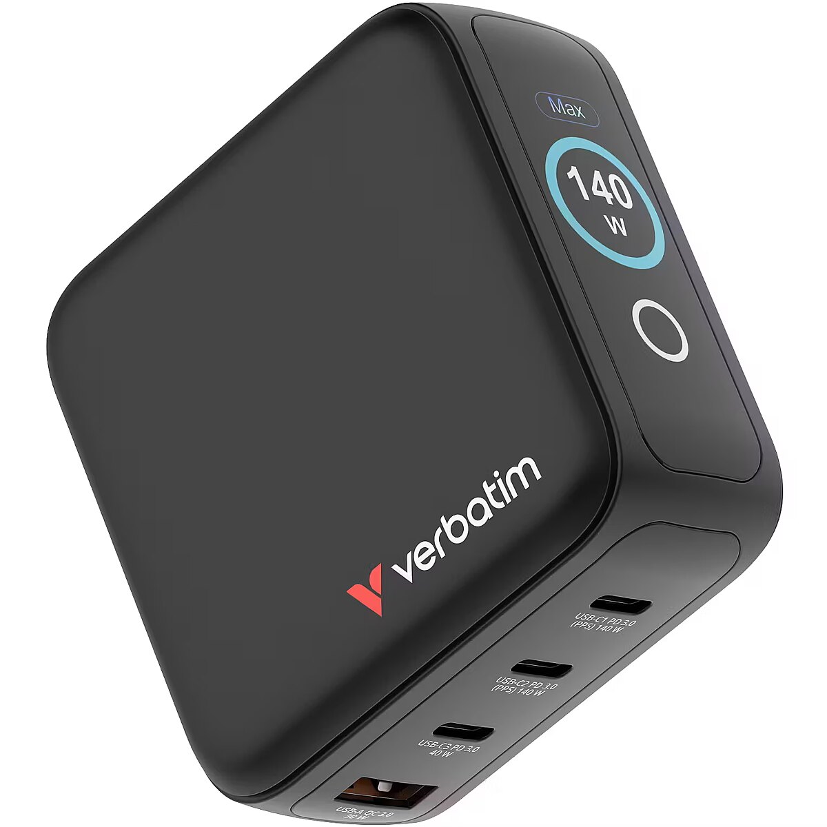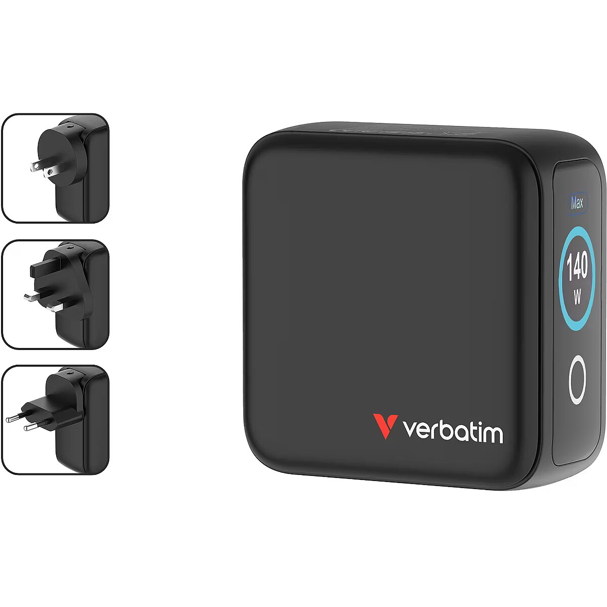 LongDesc - 140W of Power Across 4 PortsDesigned for maximum versatility, this mini GaN wall charger delivers up to 140W total output through its four ports. Power a laptop, tablet, and multiple mobile devices all at once while the TFT display gives instant feedback on each port’s performance. With PPS (Programmable Power Supply) technology, the charger intelligently adjusts output to each connected device for fast, safe, and efficient charging.Smart DisplayThe integrated touchscreen display shows real-time insight into the GaN Charger’s performance. Switch between modes to view total wattage, individual port power output, total charging time, and charging status—Eco or Turbo Boost. The display can also be flipped, ensuring it’s easy to read no matter how the charger is oriented in the socket.Safe and Reliable GaN PerformanceBuilt using Gallium Nitride (GaN) technology, this charger offers high efficiency and cooler operation in a smaller form factor. It features comprehensive protection systems against overcurrent, overvoltage, overheating, and short circuits. Combined with a fireproof PC shell, it provides durable, reliable performance every time you plug in.Made for Life on the GoWith its replaceable EU, UK, and US plugs, it’s the ultimate travel companion. The compact design saves space in your bag while ensuring you can charge all your devices anywhere in the world. Whether at home, in the office, or on a business trip, the Verbatim Mini GaN Charger with Display keeps your devices powered up safely and efficiently.