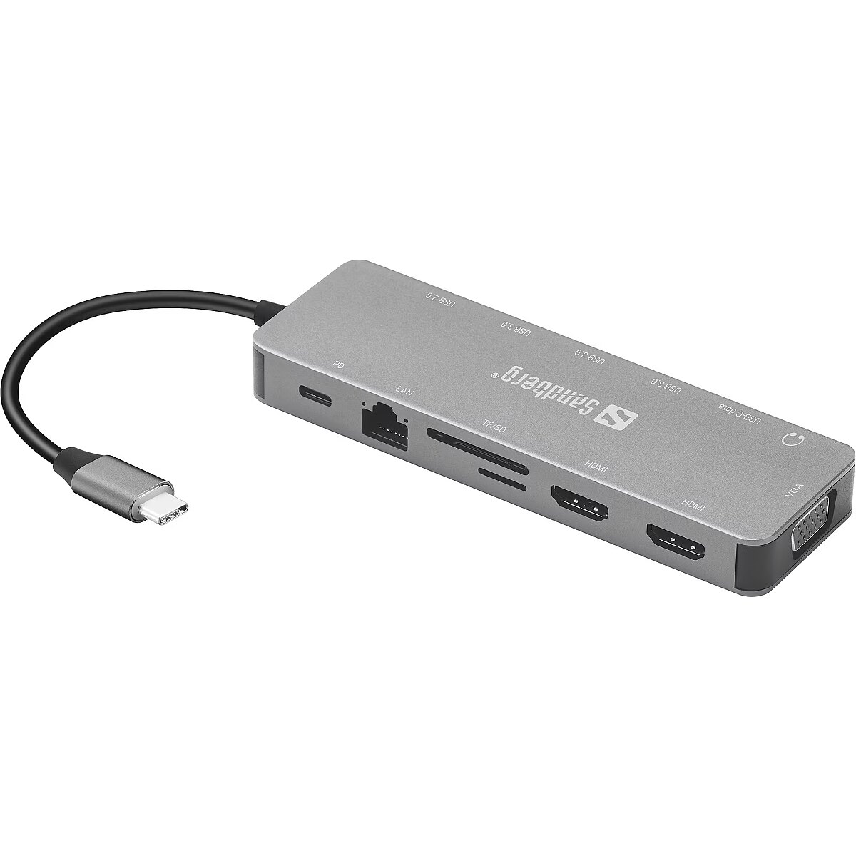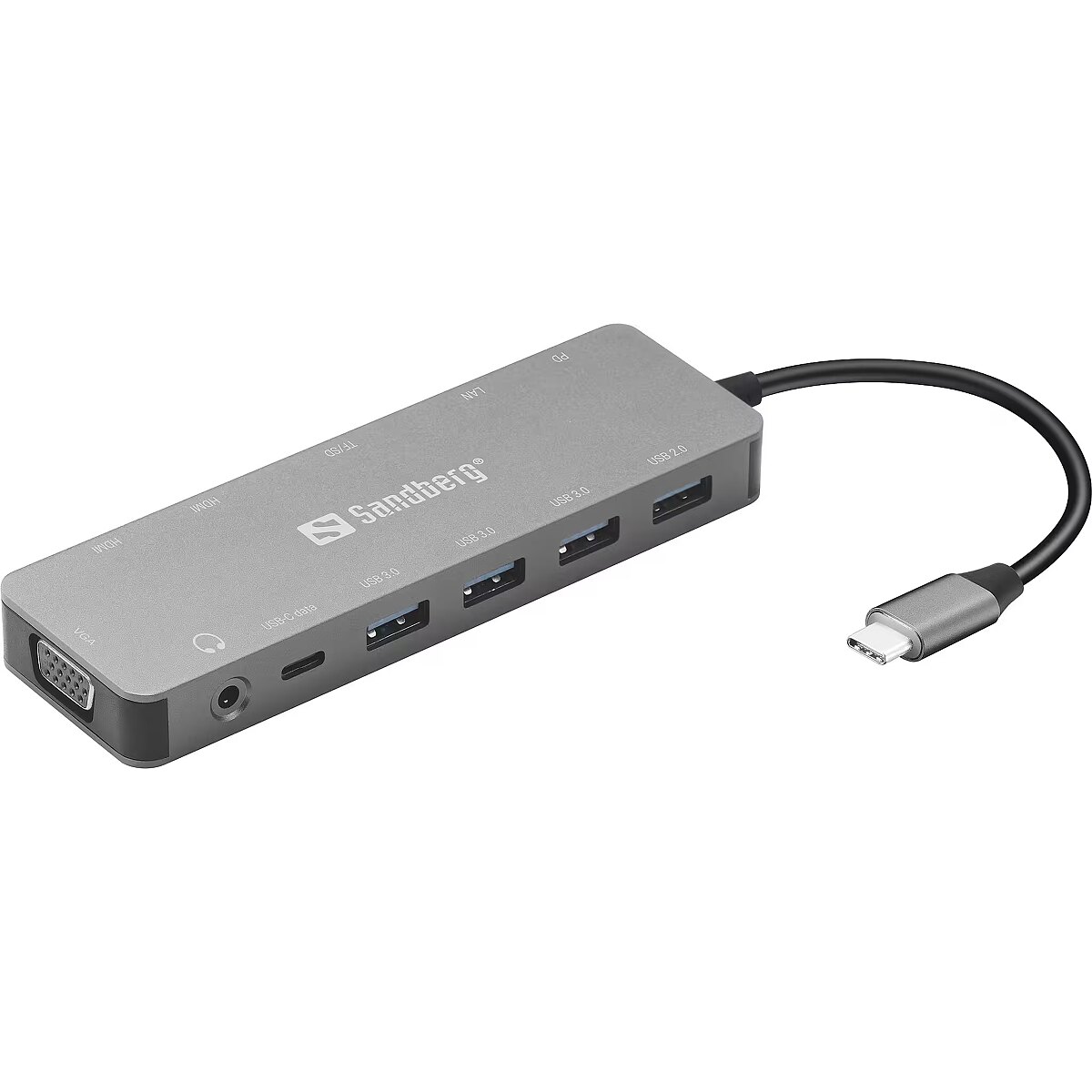 LongDesc - With just one USB-C connection to your laptop Sandberg USB-C 13-in-1 Travel Dock gives you the possibility of connecting all your gear:•4 USB ports for mouse, keyboard and external hard drive, for instance•3 monitor connectors, respectively 2xHDMI and 1xVGA with the possibility of connecting 3 screens simultaneously•Ethernet port for extremely fast Gigabit network•Audio port for headset and microphone•Card reader for memory card•Power connector for full strength USB-C power supply up to 100W•USB-C data connector