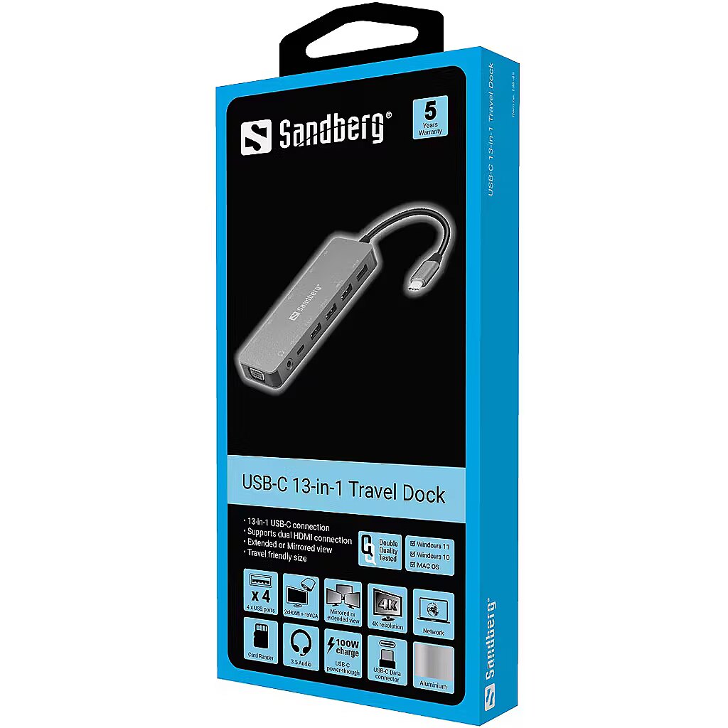 LongSummaryDescription - Sandberg USB-C 13-in-1 Travel Dock. Connectivity technology: Docking, Host interface: USB Type-C, USB Power Delivery up to: 100 W. Ethernet LAN data rates: 10,100,1000 Mbit/s. Product colour: Aluminium, Compatible memory cards: MMC, MicroSD (TransFlash), MicroSDHC, MicroSDXC, HD type: Full HD. Power source type: USB. Windows operating systems supported: Windows 10, Windows 11, Mac operating systems supported: MacOS