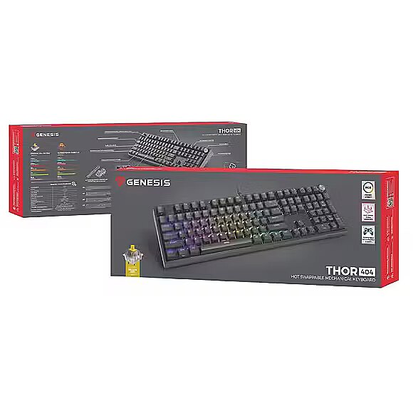 LongSummaryDescription - GENESIS THOR 404. Keyboard form factor: Full-size (100%). Keyboard style: Straight. Connectivity technology: Wired, Device interface: USB, Keyboard key switch: Mechanical, Keyboard layout: QWERTY. Backlight type: RGB LED. Recommended usage: Universal. Product colour: Black
