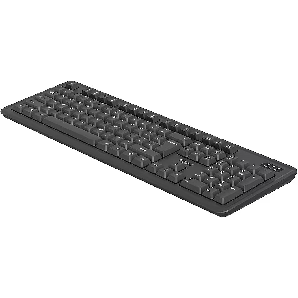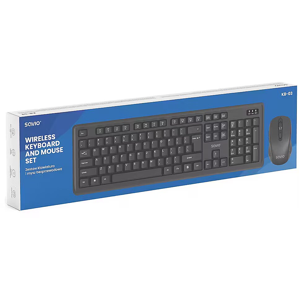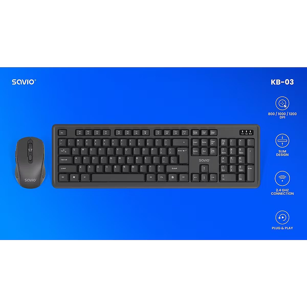 Description - Wireless keyboard and mouse set KB-03  The Savio KB-03 wireless set is a complete solution for comfortable, organized work at home or in the office. The full-size keyboard with a US layout (American key layout, 104 keys) ensures quiet, smooth typing even for many hours, while the ergonomic mouse fits comfortably in your hand and allows you to adjust the pointer precision to your preferences. Both devices connect to the computer via a USB (Universal Serial Bus) receiver, providing a stable wireless connection.   2.4 GHz Wireless Connection The wireless connection operates on the 2.4 GHz band (a standard radio frequency for wireless devices), ensuring a stable signal without noticeable delays. Thanks to the receivers, you can use both the keyboard and mouse while keeping your desk tidy and maintaining full freedom of movement. Plug & Play Mode (ready to use immediately) The set works in Plug & Play mode (no additional drivers required). Simply insert the USB receiver into your computers port, place AA batteries (not included) into the devices, and you can start working right away. The Savio KB-03 is compatible with Windows XP / Windows Vista / Windows 7 / Windows 8 / Windows 10 / Windows 11, Linux, macOS and Android, so it easily fits into your existing environment. Adjustable Sensitivity: 800 / 1000 / 1200 DPI The mouse sensitivity can be adjusted to three levels: 800, 1000, and 1200 DPI (dots per inch, a measure of pointer sensitivity). Lower DPI ensures higher precision for office work and document editing, while higher DPI allows faster cursor movements when browsing the internet or working on large screens. Slim Design The slim, lightweight design emphasizes a minimalist workspace style and enhances everyday comfort. The keyboard is designed for durability with a key lifespan of up to 5,000,000 clicks and its low profile and springy keystroke provide quiet, pleasant typing all day long. Keyboard specification: Keyboard layout: US (104 keys) Interface: 2.4 GHz USB receiver Power supply: 1 × AA battery (not included) Key lifespan: up to 5,000,000 clicks Compatibility: Windows XP, Vista, 7, 8, 10, 11 / Linux / macOS / Android Mouse specification: Radio frequency range: 2400 MHz 2483.5 MHz Maximum radiated power within the operating frequency range of the radio device: 4 dBm Optical resolution: 800 / 1000 / 1200 DPI Power supply: 1 × AA battery (not included) Dimensions: 109 × 65.1 × 38 mm Weight: 58 g Color: black Compatibility: Windows XP, Windows Vista, Windows 7 / 8 / 10 / 11, Linux, macOS, Android