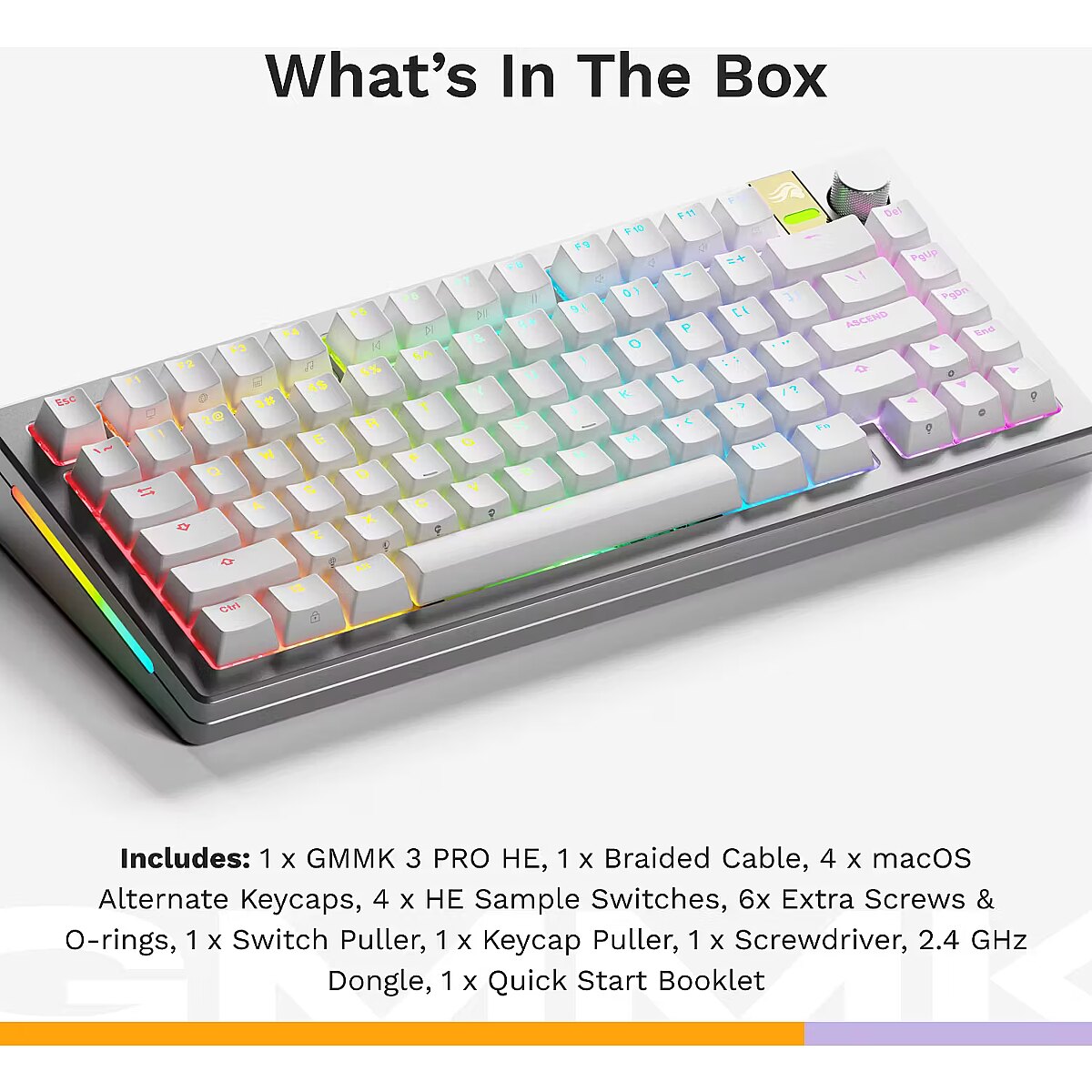 LongSummaryDescription - Glorious Gaming GMMK 3 PRO HE 75% Prebuilt Wireless Silver - US. Keyboard form factor: 75%. Keyboard style: Straight. Connectivity technology: Wireless, Device interface: RF Wireless + Bluetooth, Keyboard key switch: Mechanical, Keyboard layout: QWERTY. Backlight type: RGB LED. Recommended usage: Gaming. Product colour: Silver