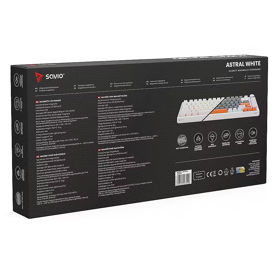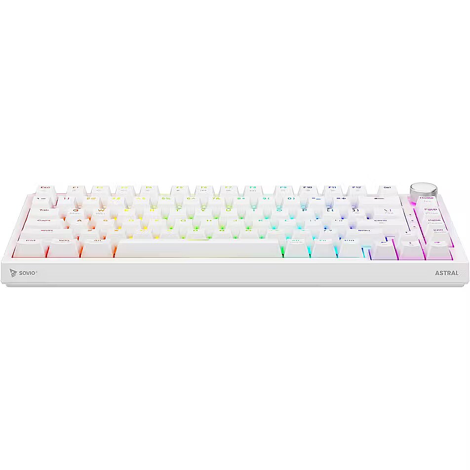 Description - Gasket magnetic keyboard ASTRAL OUTEMU White Jade RGB white Meet ASTRAL the keyboard that changes the rules of the game. This isnt just another classic mechanical keyboard. Its an advanced weapon in your arsenal, built on revolutionary magnetic technology. Encased in a compact 82-key layout, it saves valuable desk space for wider mouse movements without sacrificing functionality. Built with a Gasket Mount structure, the keyboard provides an incredible typing and gaming experience. Thanks to the metal plate with silicone gaskets and layers of damping and sound-absorbing foam, every keystroke feels soft while unwanted echoes and noise are completely eliminated. Full N-key Rollover and Anti-ghosting In the heat of battle, every millisecond and every command matters. ASTRAL White comes equipped with full N-key rollover. What does that mean? You can press all keys at the same time, and the system will flawlessly register each one. This feature is complemented by Anti-ghosting technology. Forget about annoying ghosts those moments when the keyboard registers a key you didnt press or fails during complex combos. Here, you can be sure that your combo executes exactly as intended. Outemu White Jade Magnetic Switches At the heart of ASTRAL are the advanced Outemu White Jade magnetic switches, which use a Hall-effect sensor to detect the position of a magnet instead of a traditional physical contact. As a result, actuation is completely contactless, significantly increasing the keyboards durability and precision. What does this mean for you? Reduced mechanical resistance and faster response compared to traditional mechanical switches Exceptional smoothness: the movement is perfectly linear and fluid Legendary durability: lifespan rated at 100,000,000 clicks  a long-term investment for years of intensive gaming Programmable RGB Backlighting The keyboard features fully programmable RGB lighting, capable of displaying over 16 million colors. With dedicated software, you can create your own macros (command sequences) and customize lighting effects to match your mood or the game youre playing. PBT Keycaps Forget about slippery, shiny keycaps that collect fingerprints. ASTRAL is equipped with PBT keycaps (polybutylene terephthalate) a material much harder and more durable than standard ABS. PBT keycaps offer: A matte, slightly textured surface for a stable grip even during intense gameplay Exceptional wear resistance the legends remain crisp and readable for years Multimedia Control Knob Full control without leaving your game. The built-in, elegant multimedia knob lets you instantly adjust or mute the volume with a single motion. No more shortcuts or minimizing your game just to hear your opponents footsteps or lower the music. Its convenience youll appreciate every day.
