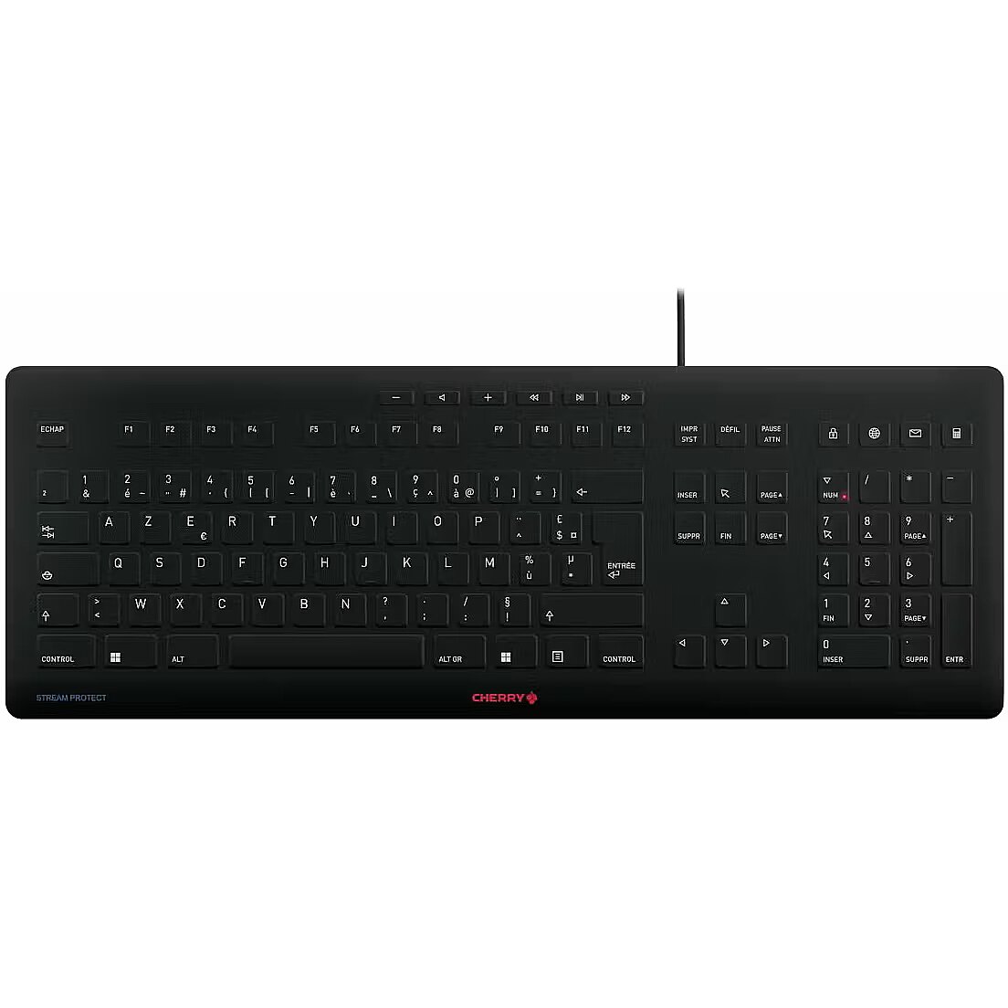 LongSummaryDescription - Contour Design STREAM PROTECT. Keyboard form factor: Full-size (100%). Keyboard style: Straight. Connectivity technology: Wired, Device interface: USB, Keyboard key switch: Scissor key switch, Keyboard layout: AZERTY, Keyboard number of keys: 115. Cable length: 1.8 m. Recommended usage: Universal. Product colour: Black