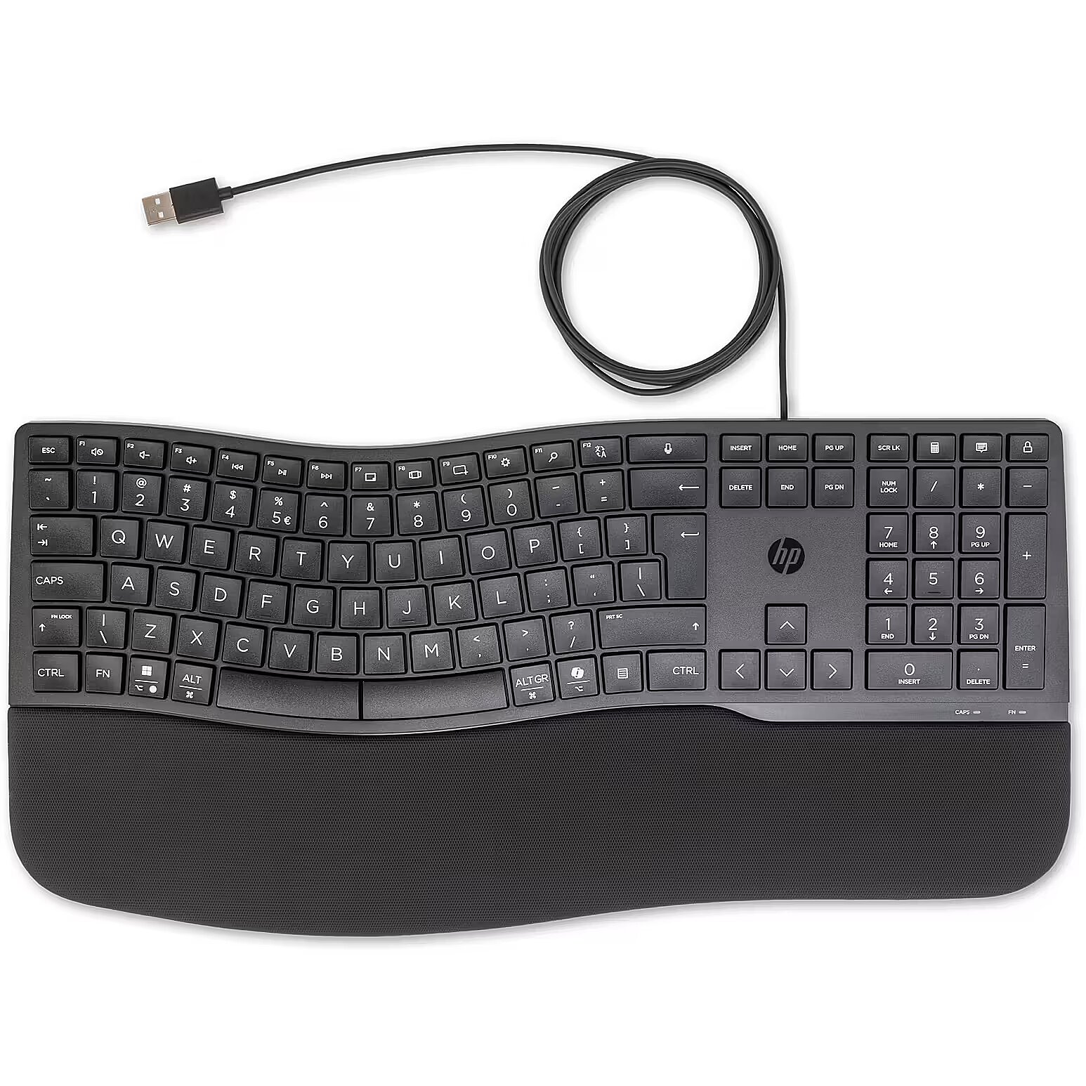 From blogging to coding, the HP 480 Comfort Wired Keyboard is designed for natural comfort and all-day productivity. Its familiar layout delivers ergonomic benefits through a wave-like shape, quiet keycaps, and a soft cushioned palm rest.