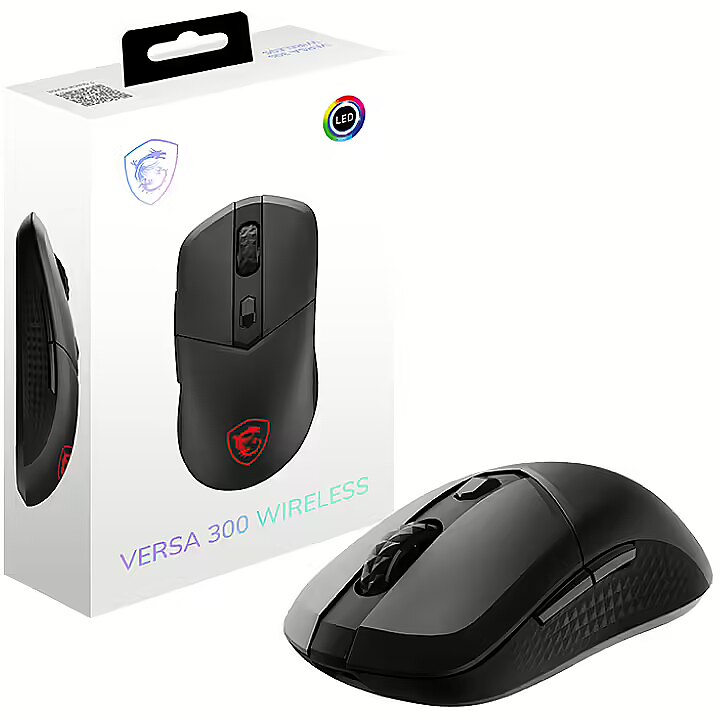 LongDesc - The VERSA 300 WIRELESS is a lightweight and versatile mouse, ergomomically designed for both gamers and professionals, weighing in at just 60 grams. It offers flexible connectivity options with MSI SWIFTSPEED 2.4 GHz wireless, Bluetooth, and wired for various setups. Featuring a highly accurate optical sensor with up to 8,000 DPI, it ensures precise tracking and responsiveness. Built with micro switches rated for over 30 million clicks and customizable RGB lighting, the VERSA 300 WIRELESS delivers durability, performance, and comfort.ERGONOMIC & SUPPORTIVE HANDSHAPEUsing a symmetrical design makes it comfortable for both right- and left-handed users. Its ergonomically optimized shape accommodates various hand sizes and is tailored to support a wide range of grip styles, including palm, claw, and fingertip grips. This versatile form ensures a secure and comfortable hold with precise control and comfort during extended use.DIAMOND-PATTERNED SIDEGRIPSThe exclusive diamond-patterned anti-slip sidegrips allow gamers to hold the mouse firmly in hand for precise maneuvers with excellent feel.PERFECT PRECISIONPowered by the advanced PixArt PAW3104DB Optical Sensor, the mouse delivers pinpoint accuracy with a maximum DPI of 8000 for responsive and precise movements. It also features preset DPI levels of 400 / 800 / 1600 / 2400 / 3200 / 4000 / 6400 / 8000, allowing quick adjustments for different scenarios.PRECISE, SATISFYING CLICKSFeaturing micro switches designed for precision and durability with a lifespan of at least 30 million clicks. These high-quality switches offer a satisfying, tactile response for consistent and accurate input. Built for intense use, they ensure reliable performance and long-lasting responsiveness, making them perfect for any task.VERSATILE CONNECTIVITYThis product offers seamless multi-mode connectivity with MSI SWIFTSPEED 2.4G Wireless, Bluetooth 5.3, and USB 2.0. Letting users easily switch between modes to match their needs for gaming or everyday use.LIGHTWEIGHT, STAMINA, SMOOTHWeighing just 60 grams, this ultra-lightweight mouse is designed for quick, precise movements with minimal effort, reducing fatigue during extended gaming sessions or long work hours for a comfortable experience. With a battery life of up to 50 hours on a single charge, it ensures reliable, uninterrupted performance throughout the day. Using pure PTFE skates helps to deliver exceptional glide and minimal friction on various surfaces, enhancing tracking accuracy and responsiveness.