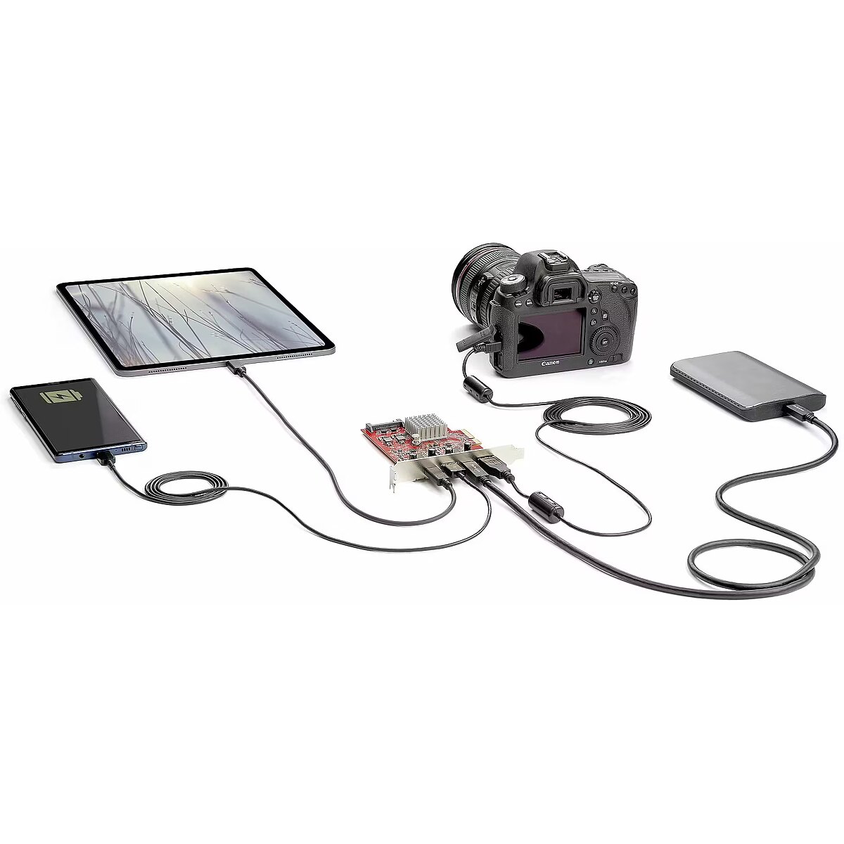 LongSummaryDescription - StarTech.com 4-Port USB PCIe Card - 10Gbps USB PCI Express Expansion Card w/ 2 Controllers - 2x USB-C & 2x USB-A ports (USB 3.2/3.1 Gen 2) - USB/USB-C PCI-e Card - Full Profile. Host interface: PCIe, Output interface: USB 3.2 Gen 2 (3.1 Gen 2), Expansion card standard: PCIe 3.0. Product colour: Red. Chipset: ASMedia - ASM3142, ASMedia - ASM2806, Data transfer rate (max): 10 Gbit/s. Windows operating systems supported: Windows 10, Windows 10 Education, Windows 10 Education x64, Windows 10 Enterprise, Windows 10..., Mac operating systems supported: Mac OS X 10.13 High Sierra, Mac OS X 10.14 Mojave, Mac OS X 10.15 Catalina, Mac OS X 11.0 Big Sur,..., Server operating systems supported: Windows Server 2008 R2, Windows Server 2012 R2, Windows Server 2019. Width: 85 mm, Depth: 112 mm, Height: 22 mm