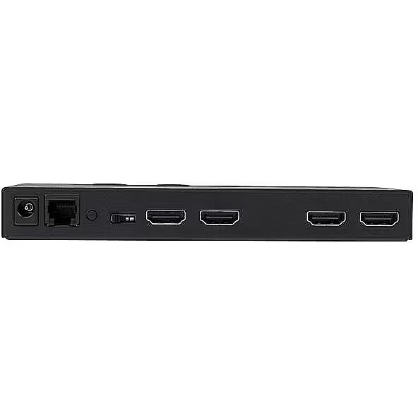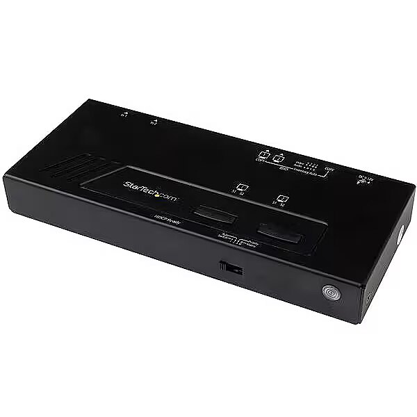 LongDesc - Save time and hassle by automatically switching between your HDMI audio/video sources. This 2x2 HDMI® matrix switcher provides the ultimate viewing experience, with support for Ultra HD 4K. It lets you connect two HDMI sources to two HDMI displays, with exceptional 4K resolution, while switching seamlessly between your video sources.Impressive image quality with 4K supportThe matrix switch supports Ultra HD 4K picture quality on two monitors while switching between content from HDMI source devices - including Blu-ray™ players or DVD players, computer systems, video game consoles, digital cable or satellite boxes, and A/V receivers.4K support ensures a higher level of image clarity and visibility, delivering four times the resolution of 1080p - 8.29 million pixels versus 2.07 million pixels. It provides a more engaging visual experience for audiences in a wide range of venues including conference centers, boardrooms, educational facilities, and commercial settings. With its exceptional image quality, 4K resolution is also ideal for bringing your digital signage to life.Fast and versatile switching optionsEnjoy hassle-free operation with four different switching modes:- Matrix switching: lets you route either HDMI source (Input 1 or Input 2) to either monitor (Output 2 or Output 3) - and independently switch two displays between two video sources.- Fast auto-switching: ensures minimal time for switching between HDMI sources. The switch provides effortless operation with advanced auto-sensing - it detects the latest connected HDMI source and automatically switches both outputs to that device. It also ensures no downtime in a digital signage application if a source signal is accidentally powered off or fails.- Priority switching: identifies the first port to have first priority for HDMI sources, which will be output on both displays.- Manual switching: enables you to manually select your HDMI source with front-panel buttons that are easy to use.An IR remote control is included in the box, enabling you to select your desired input source remotely. The RS-232 serial control interface ensures easy remote operation with serial control enabled devices.Hassle-free setup with plug-and-play installationThe matrix switch is easy to install. EDID emulation saves you time during setup by ensuring all of your display settings, such as native resolution and refresh rate, are communicated between your display and video source devices. The built-in EDID copy feature maximizes compatibility with your 4K display, to ensure a convenient plug-and-play installation and the sharpest image quality.The VS222HD4K is backed by a 2-year StarTech.com warranty and free lifetime technical support.