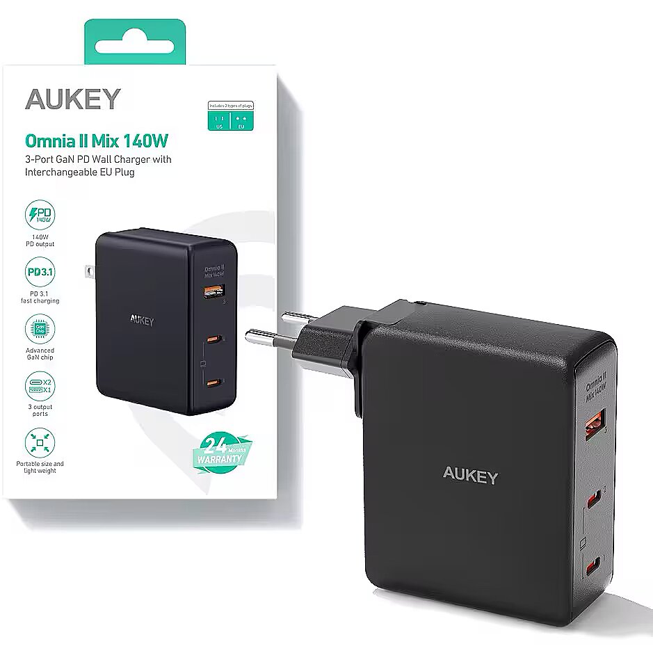 Description - AUKEY PA-B7O Black GaN Omnia II Ultra-fast wall charger 140W PPS 3xUSB (2xUSB-C and 1xUSB-A) Power Delivery 3.1 (USB-PD 3.1) (140W) GaN - the most modern solution using gallium nitride (GaN) Universal! charges phones, laptops, tablets and other devices Adapters for US, UK and EU sockets included With Power Delivery PD 3.1 fast charging technology, this charger ensures that your devices are charged in the shortest possible time, saving you time and energy. Aukey PA-B7O has a powerful 140 W Power Delivery output, which allows for effective and fast charging of even the most demanding devices. The advanced GaN chip built into the design of this charger makes it smaller, lighter and more efficient than traditional chargers, making it a convenient and practical solution for traveling or charging while on the move. This charger comes with interchangeable plugs for the US, UK and EU, making it a versatile and convenient solution for use when traveling internationally. GaN power integrated circuit 4x faster charging despite its small size Device charging is up to four times faster thanks to the advanced GaN power integrated circuit, and Dynamic Detect technology ensures optimal charging. The model is also 20% smaller and lighter than traditional 90-watt chargers. Elegance, minimalism and solid workmanship. The three-port Aukey Omnia II PA-B7O charger, with dimensions 64 x 79 x 32 mm and a weight of 268 grams, is distinguished by its interesting design and subdued black color. It fits easily with the rest of the equipment, and its portability means you can easily take it with you wherever you need it. Attention is also drawn to the high-quality materials from which this model is made, they guarantee its durability and resistance to accidental damage or scratches. The most important features: Fast charging in the Power Delivery (USB-PD) 3.1 standard Very high power of 140W - Thanks to which you can charge your devices much faster than with a standard charger 3 USB ports - (2xUSB-C and 1xUSB-A) allow you to charge 3 devices at the same time Durable and durable The charger housing is made of high-quality, durable, varnished ABS. Elegant and durable. Abrasion and scratch resistant Universal - Allows you to charge GPS devices, Bluetooth headphones, MP3 players, mobile phones, iPhone, iPad, iOS, Android, laptops and more Compact size and modern, very elegant design The control chipset adjusts the current to the device, protecting it against damage 7 levels of protection thanks to AUKEY Entire Protect and Qualcomm INOV - Against overcharging, discharge, overvoltage, overheating, overcurrent, short circuits and electromagnetic field. Complete protection of the charger, the device being charged and the network installation Power Delivery (USB-PD) 3.1 USB-C Power Delivery - this is the latest charger standard that allows the transfer of higher power (up to 140W) via the USB-C connector. Chargers with this standard can be used to power various types of devices, including laptops! Safety and very high power in a small housing The AUKEY PA-B7O mains charger dynamically adjusts the output power to the type of device. A safe charging system with variable voltage and high throughput allows you to charge modern devices in a surprisingly short time. Whether you're in a hurry to get to work or have a long journey ahead of you. For slightly older devices, the charger will slow down and charge them at a speed that is safe for them. The AUKEY EntireProtect security system will protect your equipment against overcharging, overheating and voltage changes, so you can safely charge your favorite devices anywhere. The most important thing is safety With integrated USB-IF certified PD protocol, you know your phone is in safe hands, even when fast charging is enabled. Set it and forget it Concerned about unattended fast charging? The Aukey PA-B7O charger will top up your devices until they are almost full, then switch to three-stage charging to protect your device. Modern, elegant design The Aukey PA-B7O charger is a universal gadget that you will quickly appreciate. It allows you to charge not only small devices such as a smartphone or headphones, but also to charge a laptop or an external monitor. Thanks to this, you will not have to use many different chargers - Aukey PA-B7O will be enough to make each of your devices ready to work. People who travel a lot will certainly appreciate the fact that the charger has replaceable adapters for EU, US and UK sockets, so you don't have to use additional adapters. Triple Power With three separate ports that don't lose speed during use, this device truly makes charging as easy as 1-2-3. Potential 140W PD3.1 Thanks to the PD3.1 140W technology, you shorten the waiting time and the charger charges your laptop with full efficiency. Increased Versatility This flexible charger is suitable for charging iPhones, AirPods, iPads, Android devices and even small laptops, making it a true one-stop-shop for all your charging needs.