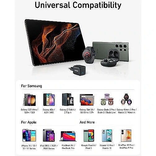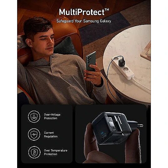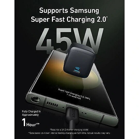 Description - Ultra High Speed: Supports up to 45W Super Fast Charge 2.0 for Samsung, so you can fully charge your Galaxy S23 Ultra in under an hour. Note: Super Fast Charging 2.0 requires a 5A charging cable (not included). Superior Security with MultiProtect: Includes a total of 10 safety features including short circuit protection, high voltage protection and temperature control to protect you and your connected devices. Powered by GaN technology: With higher energy efficiency and improved heat dissipation, gallium nitride (GaN) makes our chargers smaller and safer, without sacrificing power. Universal Compatibility: Featuring PowerIQ 3.0 technology that provides optimized charging for virtually any mobile device, including phones, tablets and more.