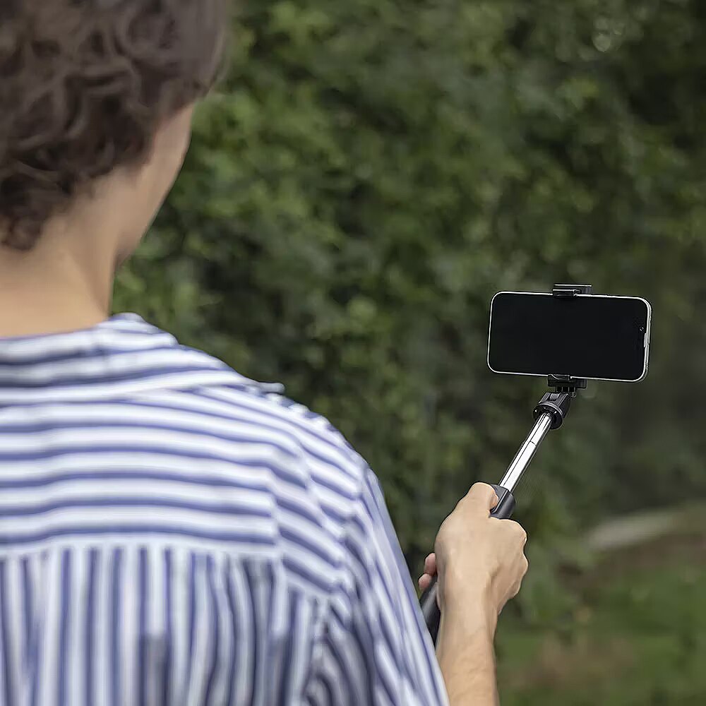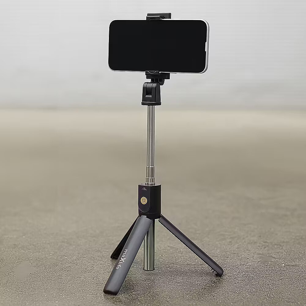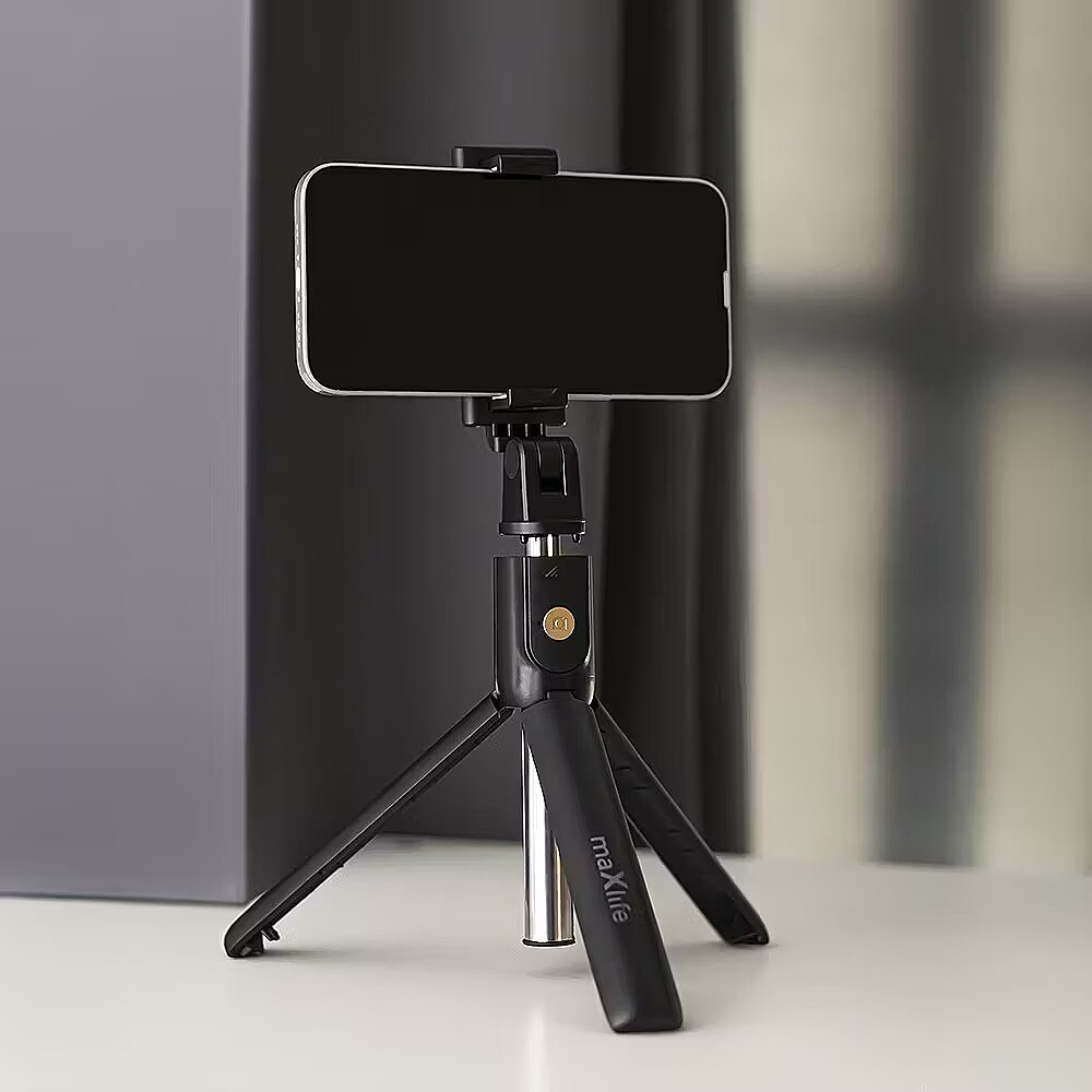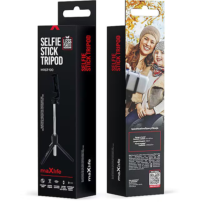 description_en - A selfie stick MXST-100 Maxlife with Bluetooth function and tripod is an indispensable gadget, ideal for taking photos and recording videos. It is compatible with most phones available on the market, both iOS and Android systems. Thanks to its lightweight and compact design, it is easy to carry – it fits in a handbag, pocket, or backpack. Simple operation is possible thanks to the telescopic handle, which extends up to 69 cm. The wireless remote allows for remote photo taking via Bluetooth, enabling camera control from a distance. It makes the product quickly and conveniently connect to the smartphone wirelessly, eliminating the need for additional cables. Te width of the selfie stick's phone holder is suitable for phones with a width of 6.4 to 8.7 cm. The selfie stick is equipped with three arms that serve as a tripod. They ensure stability while taking photos or recording videos. The 360° rotation allows you to adjust the holder to the appropriate position and take photos from different perspectives. The selfie stick MXST-100 with Bluetooth function and tripod is the perfect solution for travelers, photography enthusiasts, and anyone who wants to capture moments in a simple and convenient way. Two-in-one tripod and hand tripod Bluetooth connection & a remote control Extends to a length of 69 cm 360° rotatable phone holder Suitable phone width: 64–87 mm
