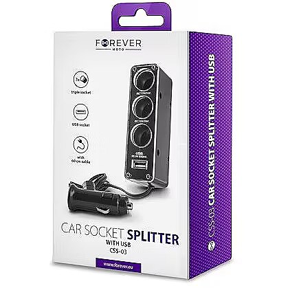Forever splitter 3in1 auto adapteris ļauj pieslēgt trīs elektroniskās cigarešu aizdedzinātāja ligzdas vienā reizē. Ierīce ir īpaši noderīga cilvēkiem, kuri automašīnā bieži izmanto vairākas elektroniskas ierīces vienlaikus, piem. Tālrunis, klēpjdators, MP3 atskaņotājs, lādētājs utt. Adapteri var pievienot praktiski visām elektroniskajām ierīcēm, kas izmanto barošanas avota ieejas spriegumu 12 V.