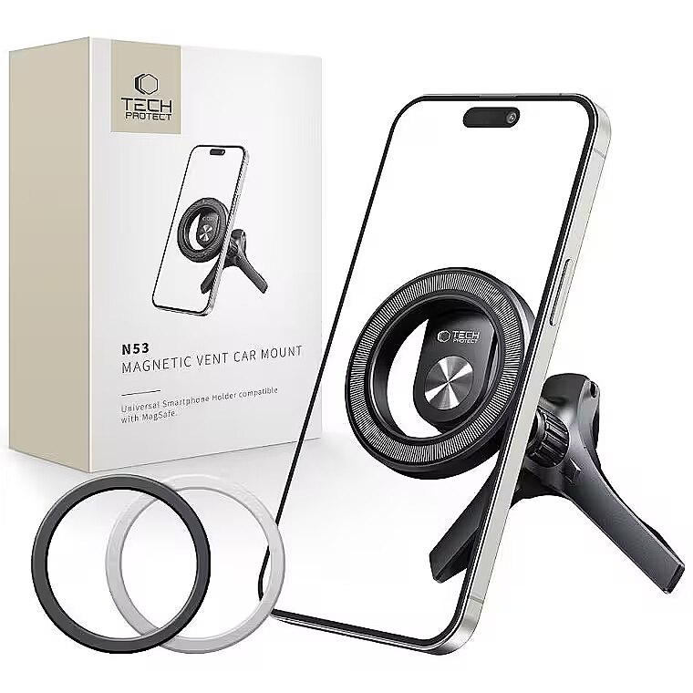 description_en - The Tech-Protect N53 Car Holder is a modern and functional solution that is ideal for any car. Made from durable nylon, fibre and ABS plastic, it guarantees long-lasting durability and resistance to damage. Its universal design fits most air vents, making it extremely practical and easy to install. Equipped with up to 17 magnets, the N52 ensures a stable hold on the device, even during dynamic driving. The elegant black design blends in perfectly with the interior of any car, adding a modern touch. With the Tech-Protect N53, using navigation, taking calls or playing music becomes convenient and, above all, safe. Compatible with Magsafe technology Durable and reliable Functional and stable Rotatable 360 degrees Mounted to the grille