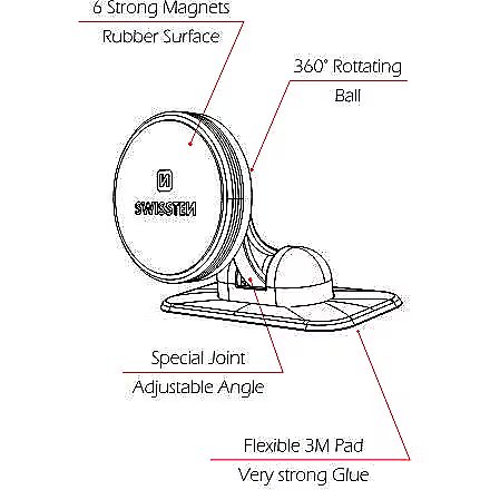 description_lv - Elegants metāla magnētiskais turētājs. Tas ir aprīkots ar sešiem magnētiem labākai tālruņa drošībai. Gumijotā virsma aizsargā jūsu tālruni no skrāpējumiem un slīdēšanas. Pateicoties elastīgajam paliktnim ar 3M lenti, tas notur pat izliektu klāju. Iepakots Swissten blisterī.