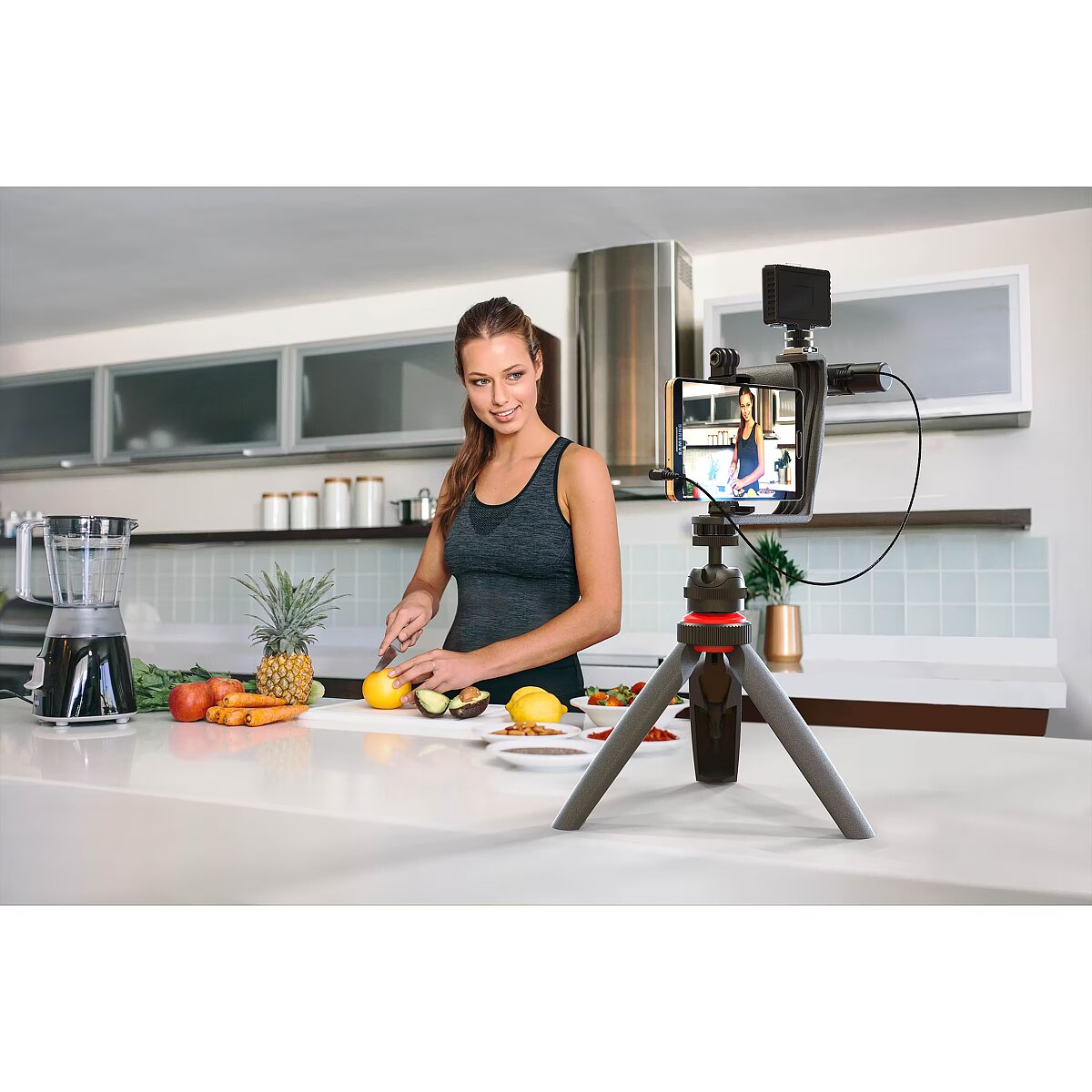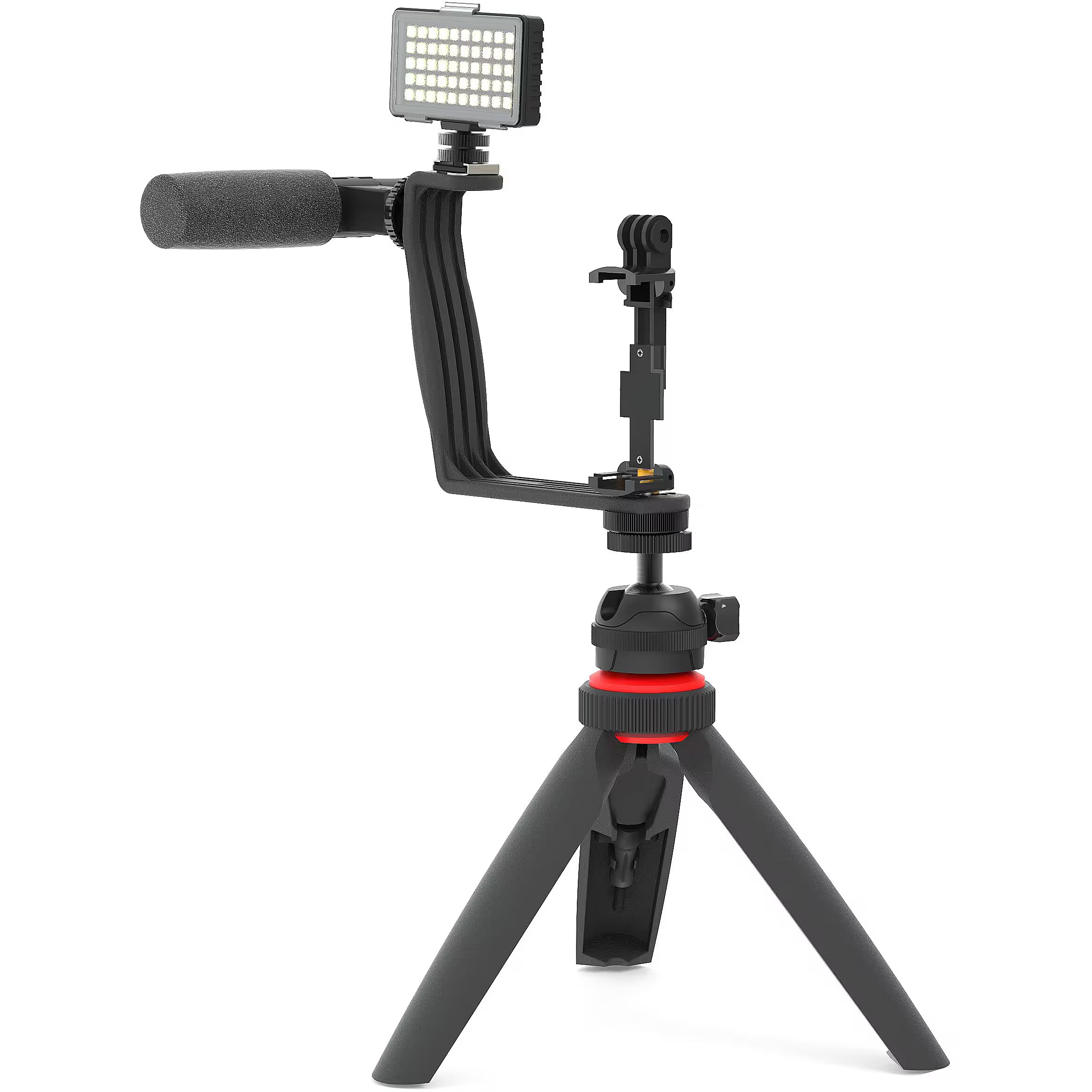 description_en - The Superstar Essential Vlogging Kit features a 50 LED compact video light efficient for your photography and videography needs. A shotgun microphone that runs up to 800 hours of recording time, so you never have to worry about running out of audio in the middle of your shoot. A multipurpose tripod which features a removable built-in wireless remote and a smart phone/action camera holder along with a bracket that helps mounting all of the items included in this kit, so you can connect your phone or camera, this is your complete video blogging solution. Kit includes: 50 LED video light Universal shotgun microphone Tripod with action camera and smartphone mount Right angle bracket Bluetooth wireless remote 3 color diffusers