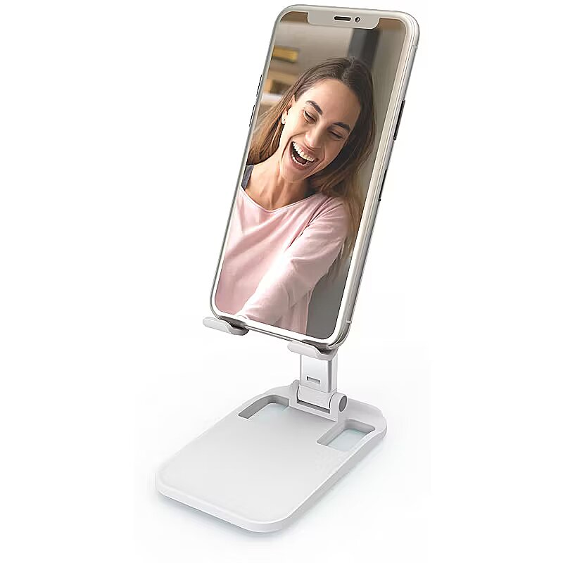 description_en - Holds your phone on its anti-slip surface mount so you don't have to hold up your phone while working, teaching, learning or during any of your important video conferences. The phone holder is foldable so it takes a minimum of space when not in use. The Smartphone Video Call Stand adjusts its angle from 0 up to 45 degrees. It expands to 16,5 centimeters. Handy smartphone & tablet stand Perfect for video calls Adjustable tilt: 0–45° Ultra portable & lightweight