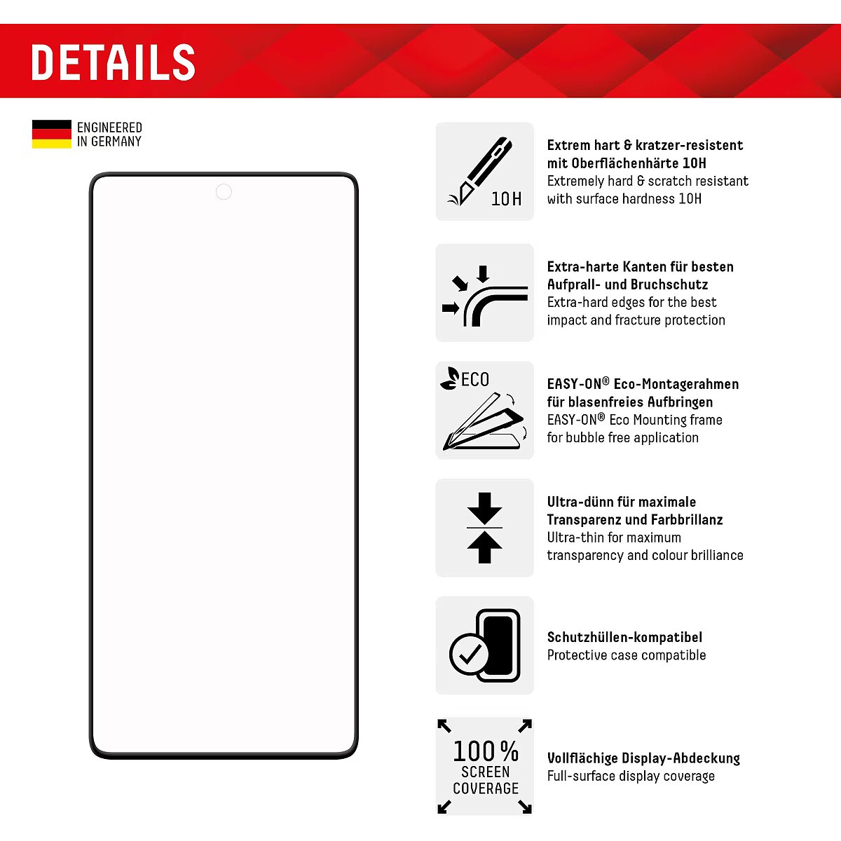 LongDesc - Full Cover or 3D/ Curved Real Glass with EASY-ON® Eco Mounting Frame Full screen coverageCompared to the so-called 2D protective glasses, Displex Full Cover protective glasses cover not only the active display area, but the entire display area. This means optimum protection of the entire display and an improved user experience: maximum protection without annoying edges.This feature is particularly advantageous for smartphones with rounded displays. Since the screen protector adapts perfectly to the rounded display and thus protects the entire display area. Tempered glass with rounded edgesAll Displex protective glasses have a surface hardness of 10H and are therefore not only more scratch-, break- and shock-resistant than comparable brand products, but even surpass sapphire glass, which is used in luxury watches and has a hardness of 9H.Even the edges, the area of the smartphone and protective glass most susceptible to breakage and impact, are specially hardened, rounded by 4-fold polishing and finished with a shock-absorbing edge. This elaborate production process further increases the protection against knocks and bumps and allows a particularly pleasant use of the smartphone. With these features, the protective glass is extremely resistant and guarantees maximum breakage resistance. Case-friendlyOur Displex protective glass is manufactured to within 5/100 mm of the smartphone contours and therefore fits perfectly on your smartphone. In addition, the protective film is ultra-thin at 3mm. This means that all standard-sized protective cases can be used with the screen protection glass. Thus, your smartphone is optimally protected all around by a combined protection of the Displex Tempered Glass and your favourite case. Anti fingerprint coatingThe top layer of our 4-Layer Technology is a high-tech plasma coating. With an extremely long-lasting effect, this coating effectively repels fingerprints. In addition, the plasma coating guarantees a soft scrolling experience. This technology not only makes your display look better, but it also keeps it cleaner and therefore requires less frequent cleaning. High-tech splinter protectionThe high-tech shatter protection integrated in the Real Glass from Displex guarantees absolute safety even if the protective glass breaks. Thanks to the composite material of the second layer in the protective glass, it does not shatter and thus guarantees absolutely safe use. If the worst should come to the worst and the protective glass has absorbed a blow, fall or impact and is broken, the Displex protective glass can be easily pulled off the display in one piece thanks to the integrated high-tech shatter protection. High-performance adhesiveOnce the protective glass has been fitted, the high-performance adhesive ensures optimum adhesion properties and a clear look. The adhesive is adapted to all display coatings of the various manufacturers so that the protective film for mobile phones holds reliably in the long term. The visual appearance is not affected either: despite the screen protection film, you can enjoy gripping videos and photos with maximum transparency and colour fidelity. Simple & bubble-free applicationWith the EASY-ON® Eco Mounting Frame and the accompanying video tutorials, mounting the tempered glass is incredibly quick, easy and precise. In addition the EASY-ON® Eco Mounting Frame is made of premium solid cardboard and is therefore not only sustainable, but also a 100% recyclable. The result is worth seeing: no crooked positioning of the screen protector on the display, no concealed openings for speakers or microphones and certainly no bubbles under the protective glass.