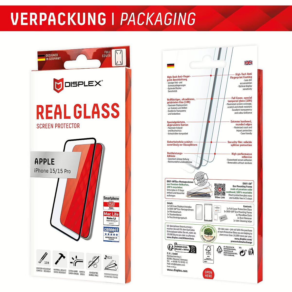 ShortSummaryDescription - Displex Full Cover Screen Protector (10H) for Apple iPhone 15/15 Pro, Eco Mounting Frame, Full Cover, Apple, iPhone 15/ iPhone 15 Pro, Dry application, Impact resistant, Scratch resistant, Dust resistant, Transparent, 1 pc(s)