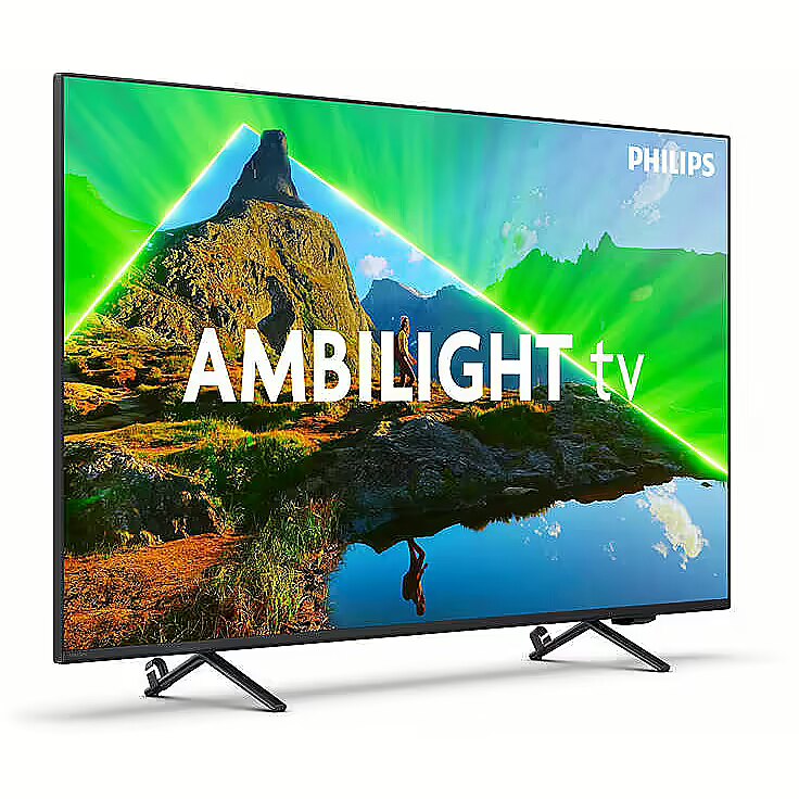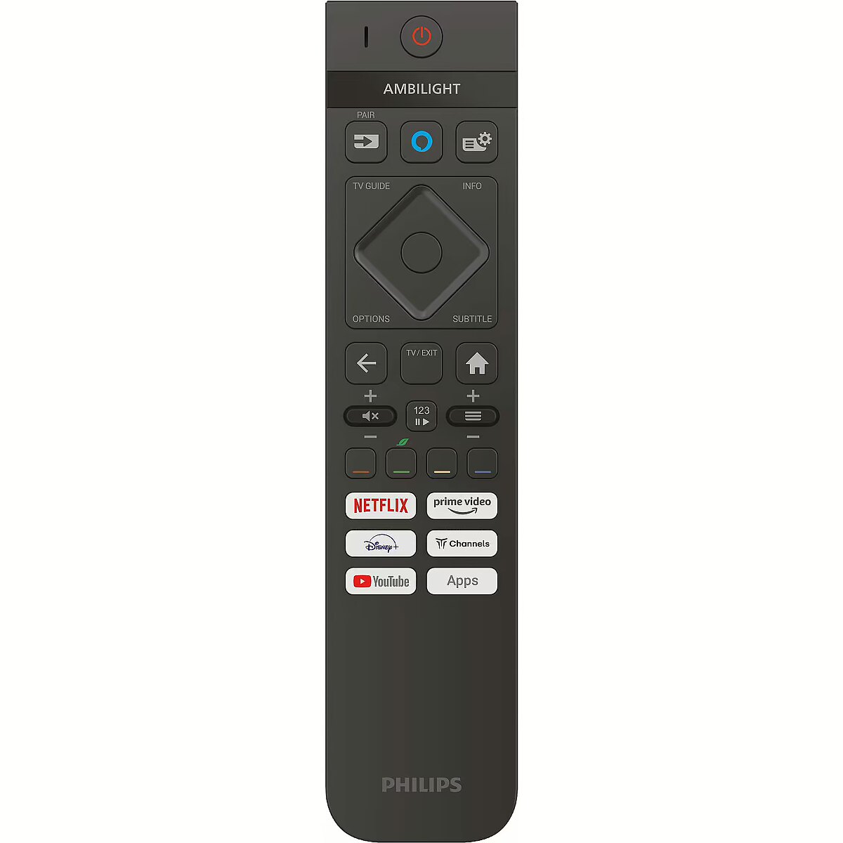 Description - 4K Ambilight TV Are you looking for more from your next TV? This 4K UHD Ambilight TV delivers razor-sharp images, Dolby Atmos sound and the amazing Ambilight system. Epic gaming, cinematic movie scenes and even a light show for your music! Compatible with voice assistants. You have your choice of voice assistants! Press the Alexa button on your remote and you can use your voice to search for movies and shows, get recommendations, control compatible smart home devices and more. You can also control your TV with Google smart speakers. Immerse yourself in what you love. Ambilight TV. Ambilight TVs are the only TVs with built-in LED lighting behind the screen that responds to what youre watching, immersing you in a halo of coloured light. Your TV feels bigger and takes you deeper into your favourite shows, movies and games. Incredibly sharp and vibrant images. A 4K (UHD) LED TV with Ambilight lets you enjoy watching shows to the fullest. The Philips Pixel Precise Ultra HD engine in the TV optimizes picture quality, ensuring that it is razor-sharp, with rich colors and smooth motion. This guarantees the best possible viewing experience. Easy searching with TITAN OS. Our intelligent TV platform TITAN OS makes it quick and easy to find your favorite show. Love series? Continue watching directly from the home screen. And if youre looking for something new, you can browse categories like action movies or dramas and see recommendations from the best streaming services all in one place. Dolby Atmos cinematic sound Dolby Atmos provides an immersive experience by placing sounds in the space around and above the viewer. Whether its a spaceship flying overhead or footsteps sneaking up behind you, youll be right at the center of the action. Great for gaming. VRR and low input lag on any console. HDMI 2.1 lets you take full advantage of your console with fast gameplay and smooth graphics. The device supports VRR technology, the low latency setting is automatically activated when you turn on the console. Ambilight game mode makes the experience even more intense. Remote control made from recycled plastic. Responsible packaging. The slim stand of this Ambilight TV is high enough to fit a soundbar underneath, and you can use Ambilight to create instant mood lighting when you're not watching TV. The TV remote control is made from recycled plastic, our packaging is made from FSC-certified recycled cardboard, and the inserts are printed on recycled paper.