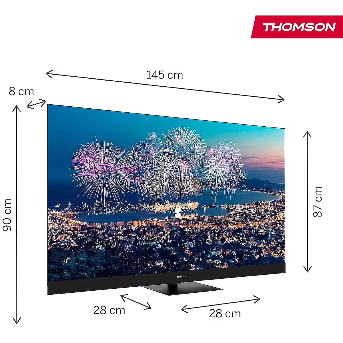 Summary - Thomson Q70 Series . Display diagonal: 165.1 cm (65"), Display resolution: 3840 x 2160 pixels, HD type: 4K Ultra HD, Display technology: QLED, Screen shape: Flat. Smart TV. Motion interpolation technology: AMR (Active Motion Rate) 60, Display brightness: 300 cd/m², Contrast ratio (typical): 10000:1, Native aspect ratio: 16:9. Digital signal format system: DVB-C, DVB-CI. Wi-Fi, Ethernet LAN. Product colour: Black