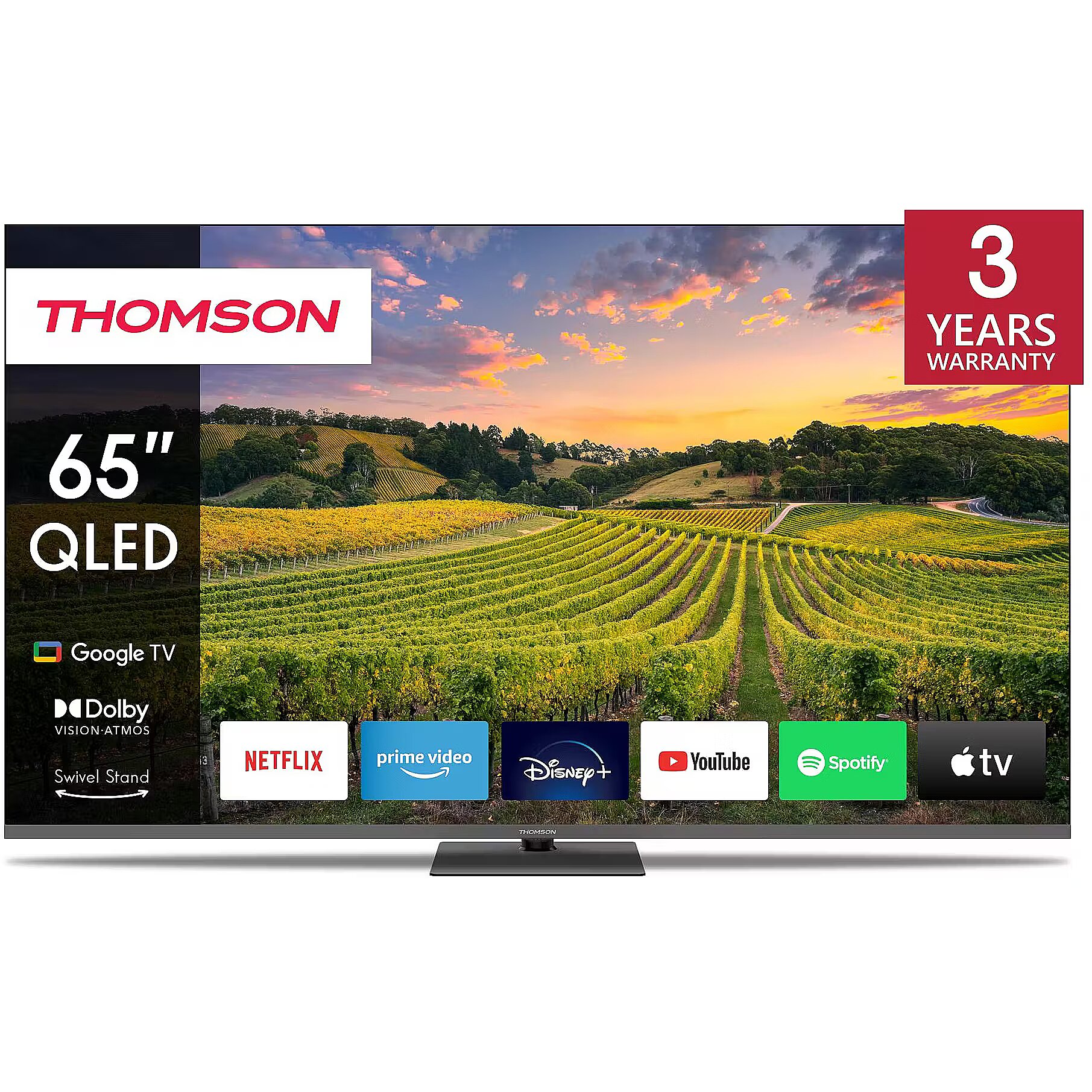 Description - Enjoy your favorite entertainment in stunning 4K UHD quality with your Thomson Google TV 65" QLED. Powered by Quantum Dot nanocrystals, a QLED display delivers balanced brightness, striking contrasts, and an expanded color range. Combined with 4K Ultra HD resolution you can capture every detail and immerse yourself in crystal clear images. Dolby Vision technology enhances the brightness in each scene, ensuring precise color reproduction for lifelike images. Enjoy dynamic audio with Dolby Atmos for an immersive TV experience. Google TV simplifies your entertainment experience by organizing content from your apps and subscriptions. Create multiple user profiles and benefit from curated recommendations. Enjoy a wide range of smart features, such as access to 400,000+ movies and TV shows, smart voice control with Google Assistant, and Google Cast to stream content from compatible smart devices to your TV. The ergonomic remote control with smooth backlighting allows you to keep an eye on everything, even in dim lighting. The integrated Google Assistant enables you to intuitively control your TV with voice commands. Search for your favorite movies, ask for recommendations based on your mood, or control compatible smart devices - all with the convenience of your voice. Benefit from increased placement flexibility with the central swivel stand and enhance your viewing experience. The innovative design enables you to effortlessly rotate your TV by up to 30 degrees, allowing you find the perfect angle for your entertainment setup. The built-in triple tuner allows reception via satellite-antenna, terrestrial antenna, or cable. So, you can receive all available channels without additional hardware.