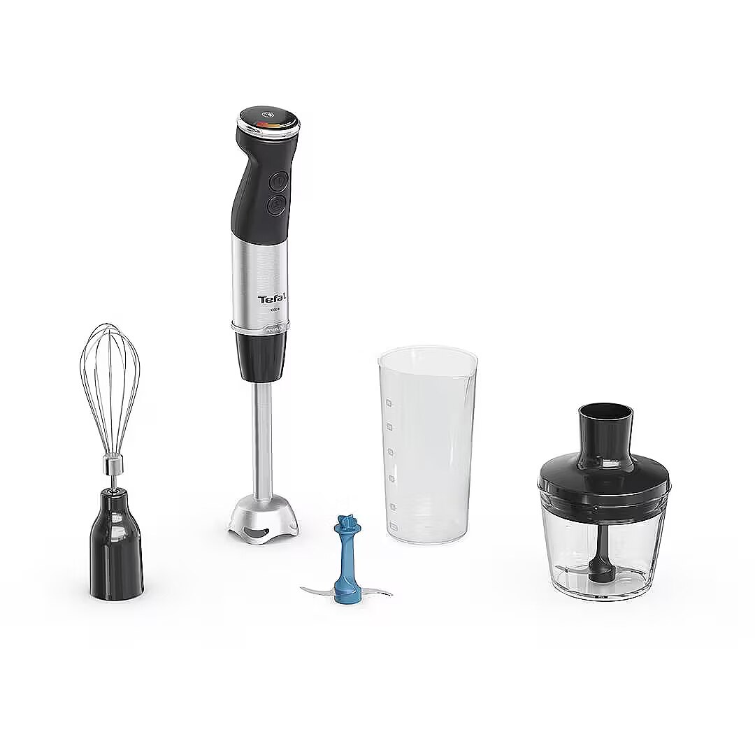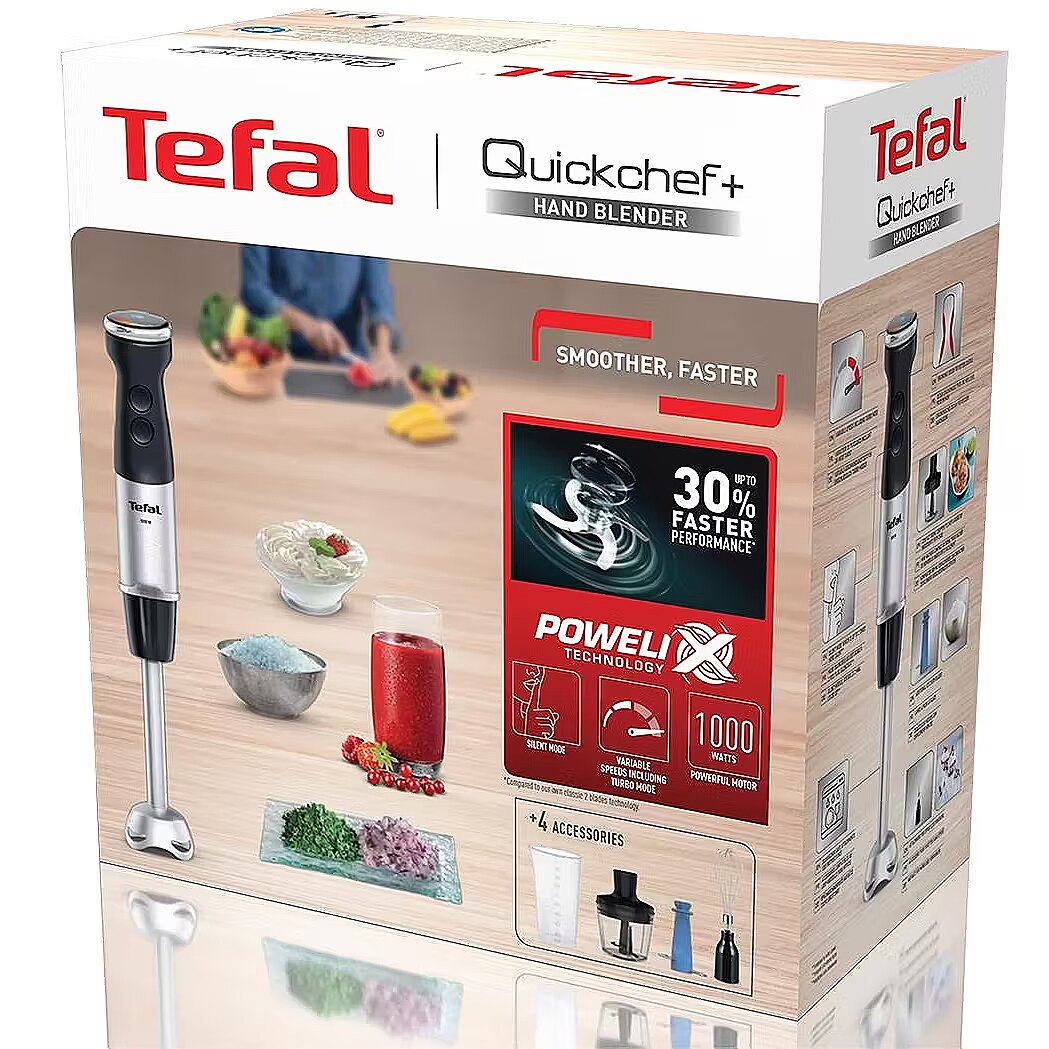MediumDescription EN - Incredible smoothness at your fingertips With the Quickchef+ Hand Blender by Tefal, enjoy optimum power with none of the effort. Exclusive Powelix Blades Technology comes together with a powerful 1000 W motor for high-performance blending that's up to 30% faster* with incredibly smooth results on even the hardest ingredients — with silence mode and a whole range of convenient features to round off the package. • Use the whisk for egg whites and homemade mayonnaise, the chopper attachment with serrated ice-crushing blades for powerful chopping, and the dosing beaker for easier blending