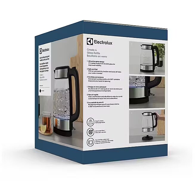 LongSummaryDescription - Electrolux E4GK1-4GB. Water tank capacity: 1.7 L. Power: 2200 W. Product colour: Black, Stainless steel, Transparent, Housing material: Glass, Stainless steel