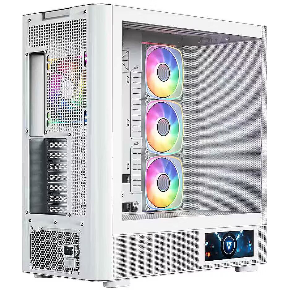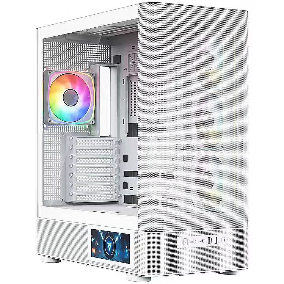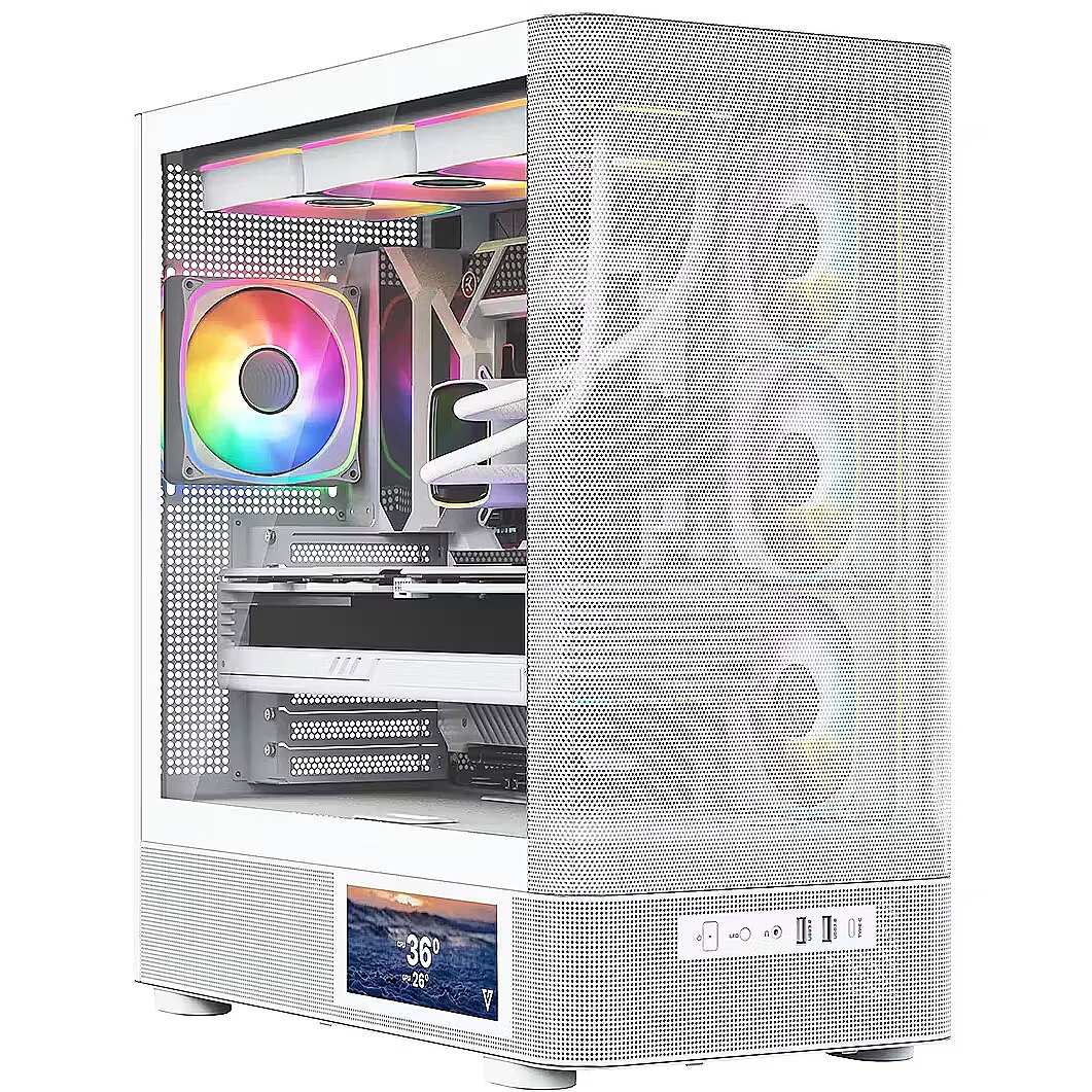 Description - PC case Volcano AQ400 ARGB MIDI WHITE The MODECOM Volcano AQ400 ARGB MIDI is a representative of the Volcano AQ case series, characterized by an eye-catching design with rounded shapes of the front panel (in this case, a perforated metal panel), support for installing motherboards with reversed connectors, four 120 mm ARGB fans included as standard with an ARGB lighting controller, and support for water-cooling radiators up to 420 mm, as well as numerous perforations on the side panels to ensure efficient cooling performance. A distinctive feature of the AQ400 version is the LCD screen located on the side of the case, which allows users to display images, play videos in MP4 format, or monitor temperatures and workload of the processor, graphics card, and RAM usage.All these features are complemented by two USB 3.0 ports and one USB-C port (USB 3.2 Gen 2). This is a case designed to showcase components and personalize the computer to your own style.