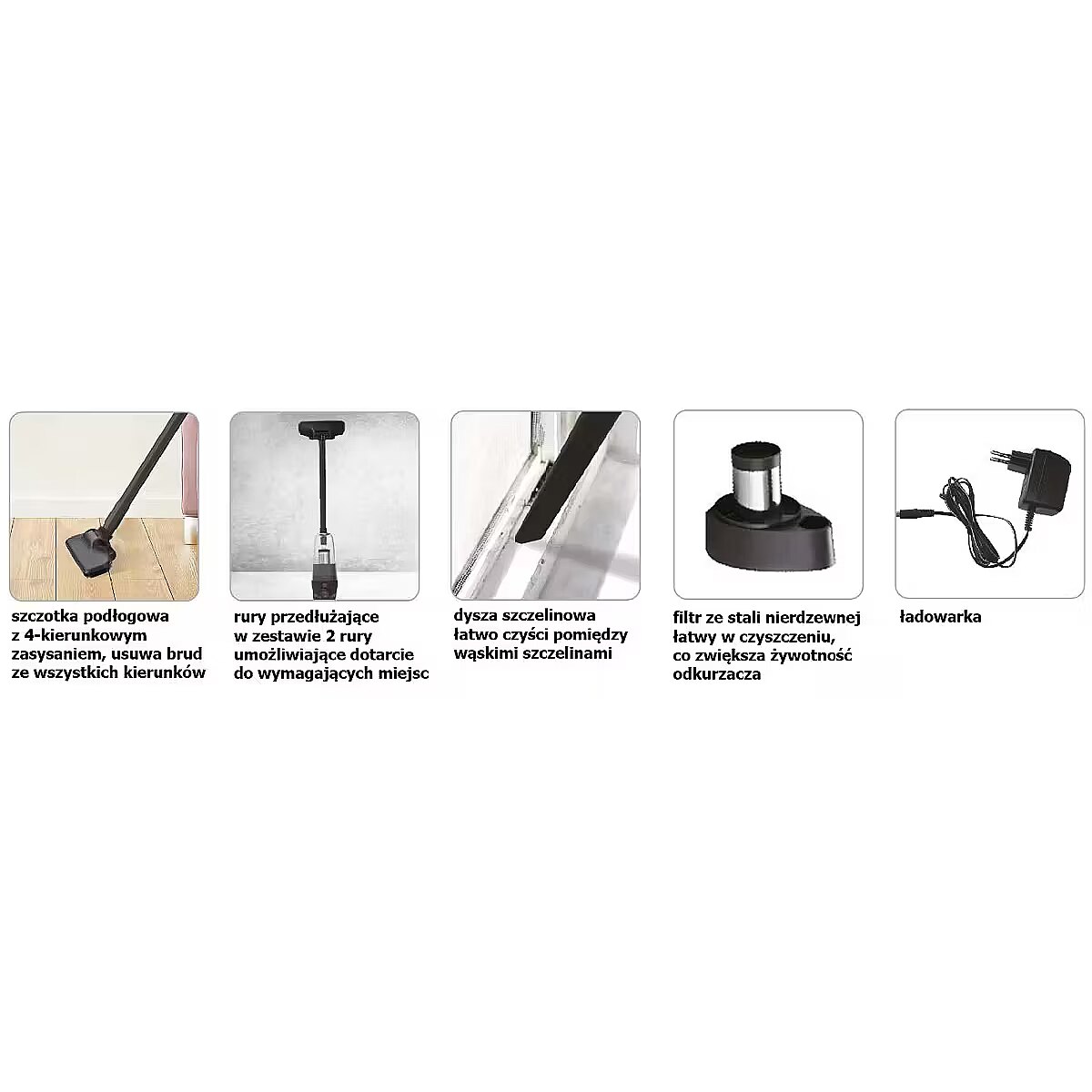 Accessories included - Szczotka podłogowa z 4-kierunkowym zasysaniem Dysza szczelinowa 2 rury przedłużające Ładowarka