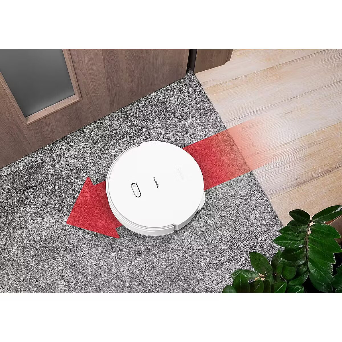 Robot sprzątający oferuje różne tryby sprzątania: Tylko odkurzanie, Tylko mopowanie, Odkurzanie a następnie mopowanie lub Odkurzanie i mopowanie jednocześnie. Możesz także ustawić poziom siły ssania: Niski dla szybkiego sprzątania, Średni do codziennej pielęgnacji, Wysoki przy silniejszych zabrudzeniach i Maksymalny dla najwyższej mocy. Dzięki funkcji Carpet Turbo robot automatycznie zwiększa moc ssania po wjechaniu na dywan, co zapewnia dokładne usunięcie zanieczyszczeń z jego włókien. Czujnik przeciwko spadkowi ze schodów