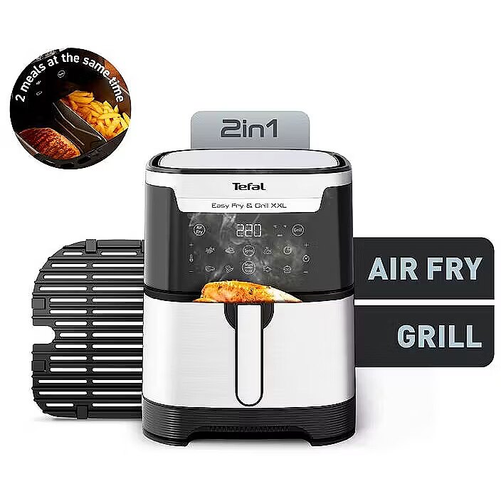 LongDescription EN - Delight your family with delicious, health-conscious meals from your own kitchen with the Tefal Easy Fry & Grill 2-in-1 Air-Fryer and Grill XXL. A removable Flexcook divider lets you easily switch from XXL capacity—that serves up to 8 people—to dual zones for cooking two different foods to be ready at the same time. Extra crisp frying technology and the die-cast grill ensure perfect searing that's crispy outside and tender inside with less oil. With 8 automatic programs, the possibilities are endless! Air-fry and grill—even at the same time. • HEALTHY CRISPY FOODS: A healthy fryer offering crispy, golden results with little to no oil—99% less added fat*;