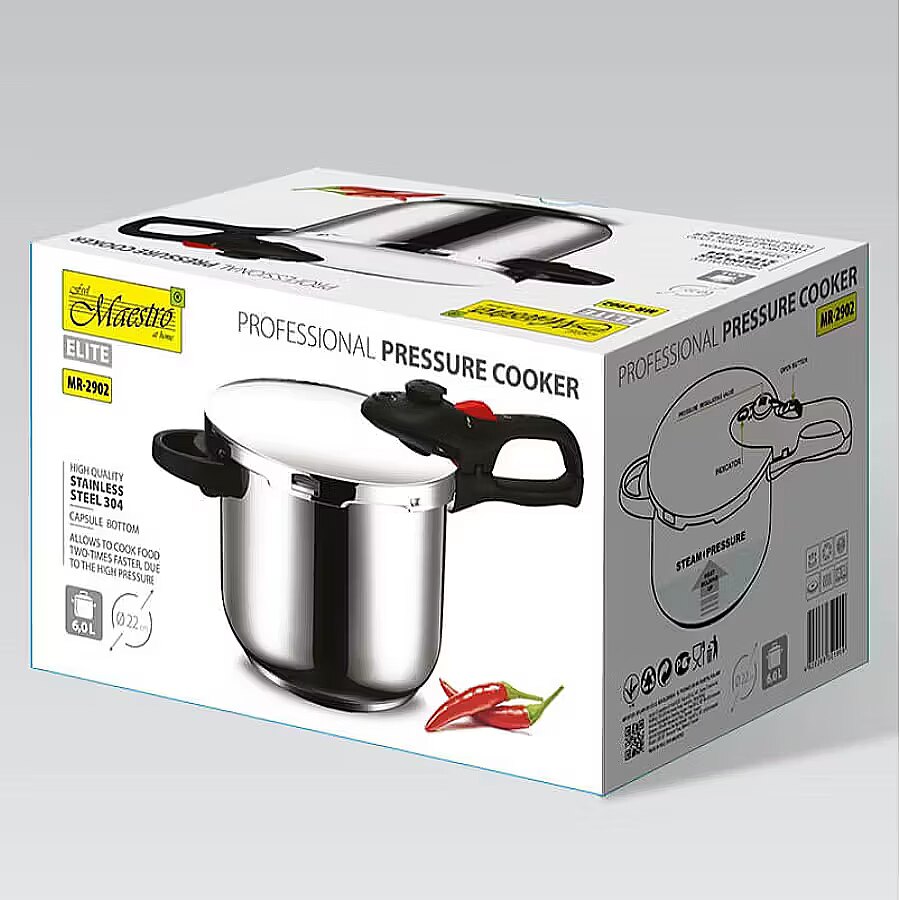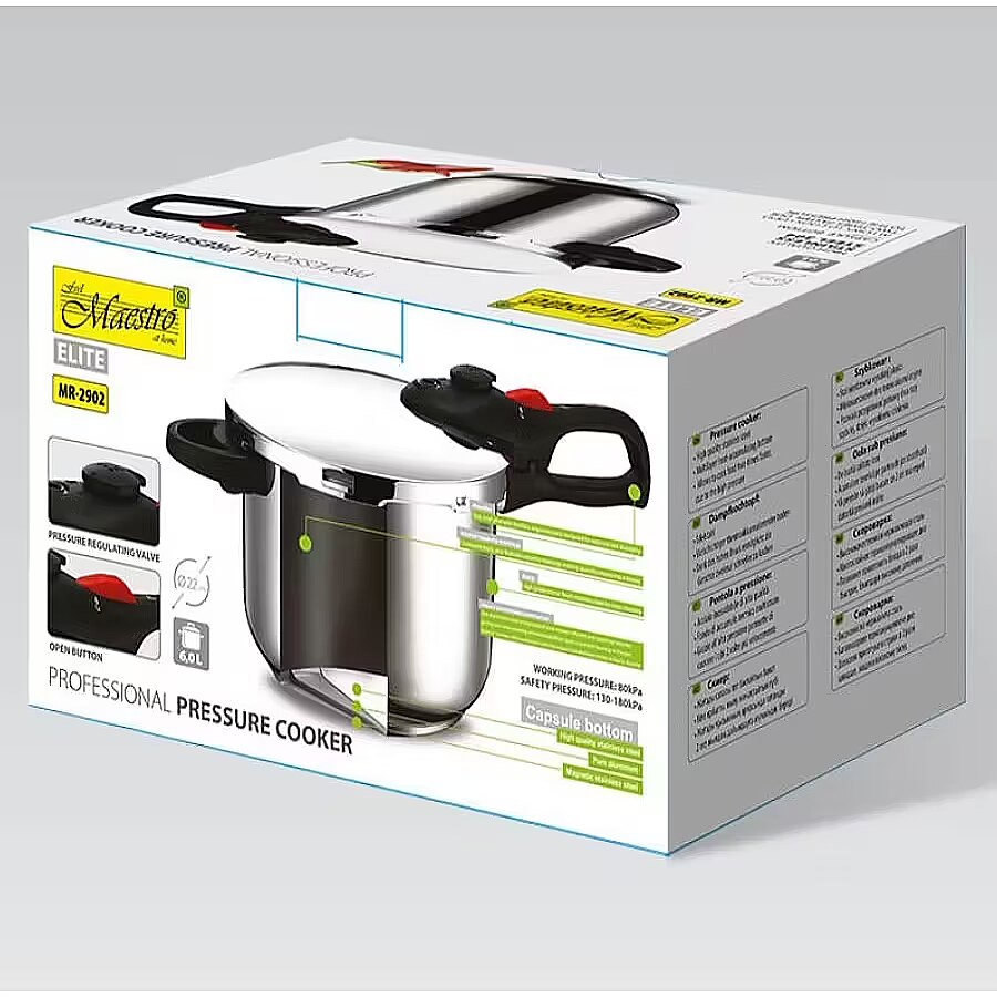 Description - Maestro MR-2902 Pressure Cooker The Maestro MR-2902 pressure cooker is a versatile appliance designed for fast meal preparation. With a 6.0L capacity, it allows you to cook portions for a larger family or prepare multiple dishes at once. The pot has a diameter of 22 cm, making it practical for use on standard stovetops. The operating pressure is 80 kPa, with a maintained pressure range of 130-180 kPa, ensuring efficient and quick pressure cooking while providing safe operation. Made of high-quality stainless steel, it guarantees durability and easy cleaning. Product dimensions are 22.5 x 45 x 24.5 cm, making it compact and easy to store in a cabinet without taking up much space. It comes with a lid featuring a side handle and sealing ring, ensuring safe and secure use.