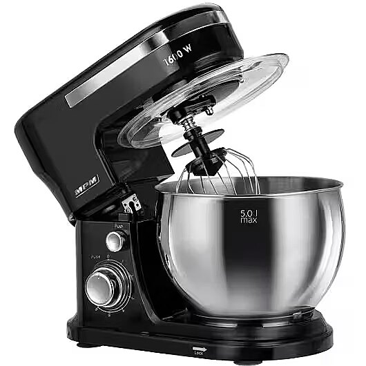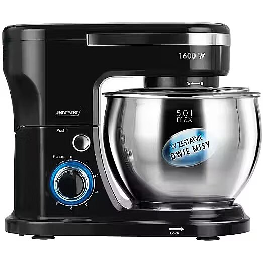 Other features - 6-stopniowa regulacja obrotów + funkcja Pulse Misa plastikowa o pojemności 4 L Misa ze stali nierdzewnej o pojemności 5 L Ruch planetarny przystawek (mieszanie wielokierunkowe) idealne napowietrzenie mieszanych składników Wyposażenie Mieszadło do mieszania wieloskładnikowych mas : składników ciast, mielonego mięsa i ryb, pasztetów, ucierania sera na sernik, ubijania gotowanych ziemniaków na purée i gęstych kremów Mieszadło do ubijania lekkich mas produktów, które muszą być dobrze napowietrzone: śmietany, białek, całych jajek, ciast biszkoptowych, kremów maślanych i budyniowych, majonezu Mieszadło do wyrabiania ciasta drożdżowego, a także makaronowego i na faworki Osłony na misę pozwalają łatwiej dozować produkty w czasie pracy urządzenia i ogranicza rozchlapywanie płynnych produktów Zabezpieczenie przed włączeniem przy nieprawidłowym montażu urządzenia