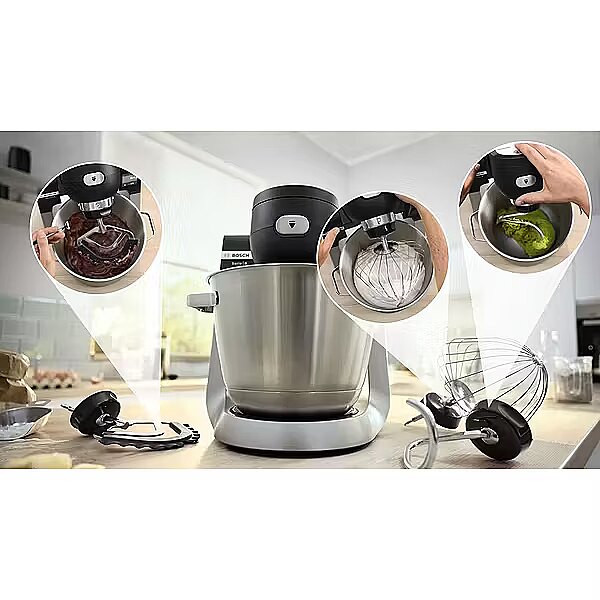 Radošam cepšanas procesam nepieciešami arī atbilstoši piederumi. Profesionālais konditora komplekts ļauj sasniegt nevainojamus rezultātus un ir ērti lietojams. Elastīga maisītājslotiņa ar silikona malu, metāla putotājslotiņa ar regulējama augstumu un āķis mīklas mīcīšanai. Visus piederumus var mazgāt trauku mazgājamā mašīnā. Lai taupītu vietu, konditora komplektu uzglabājiet traukā, ievietotu praktiskā piederumu maisiņā. Vienkāršai un ātrai gatavošanai