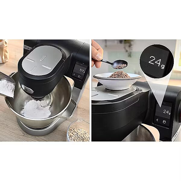 Follow your recipe with precision. The new Series 6 kitchen machine displays 1-gram increments. It also measures milliliters of oil, milk and water, ounces (oz), and pounds (lbs). You can weigh directly in the bowl, on the accessories, or even small amounts at the top. 3D Planetary Mixing technology