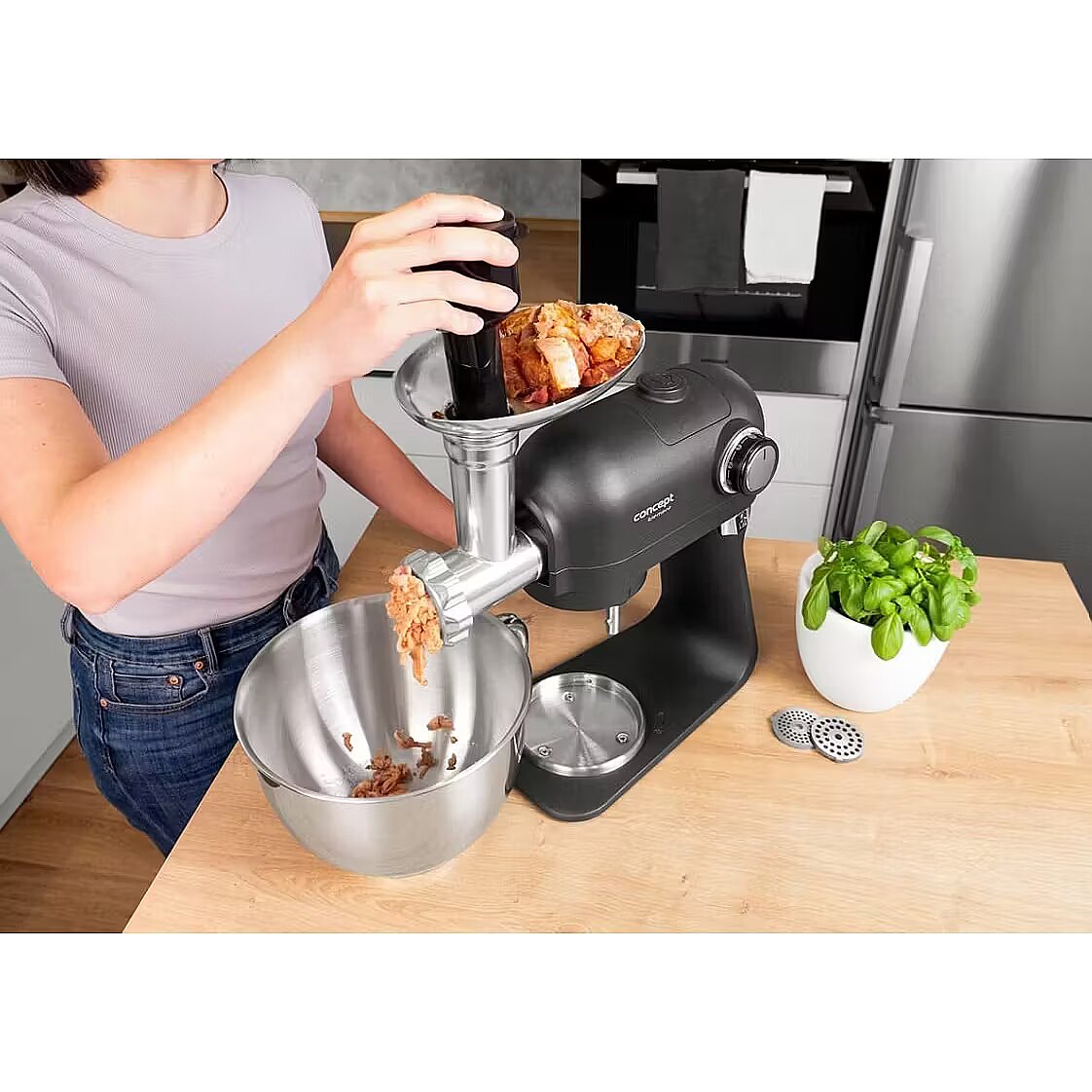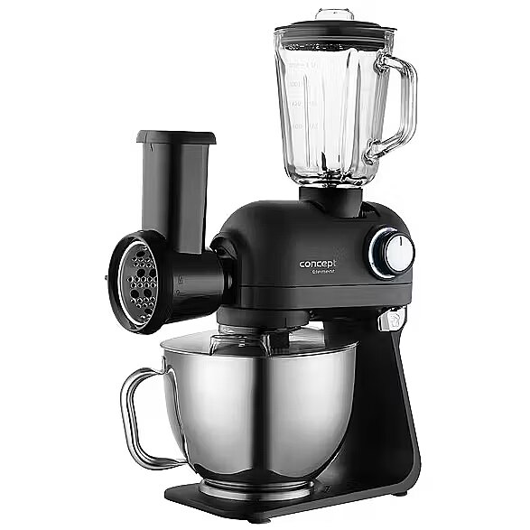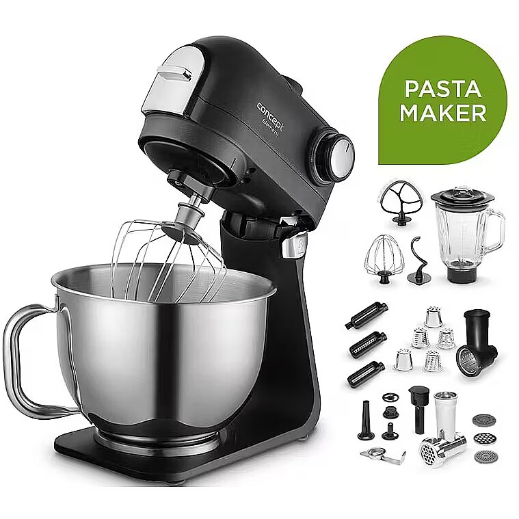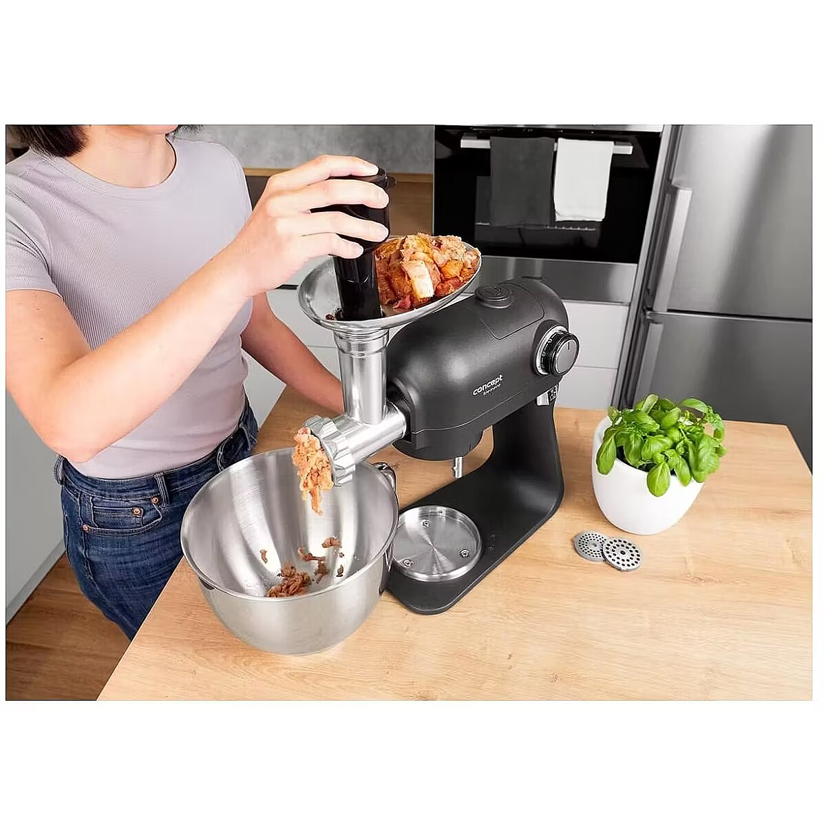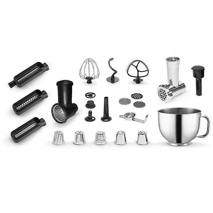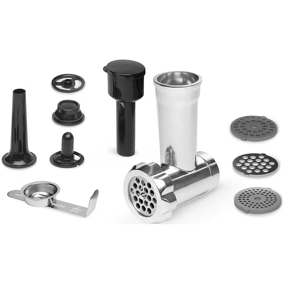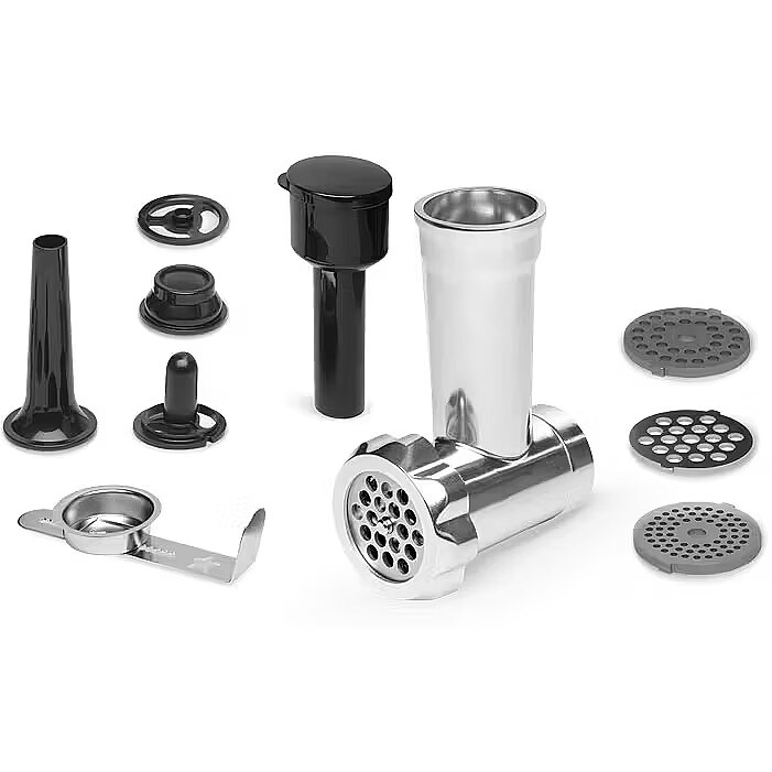 Accessories included - 5-litrowa misa ze stali nierdzewnej z uchwytem + pokrywka W pełni metalowe mieszadła: flexi trzepaczka, trzepaczka do ubijania, hak do ciasta Szklany blender o pojemności 1,5 l Maszynka do mięsa (3 wymienne tarcze o różnej grubości mielenia) + przystawki do napełniania parówek i kiełbas + przystawka do formowania ciastek 3 przystawki do makaronu (lasagne, trenette, tagliatelle) Tarka z 5 wymiennymi przystawkami