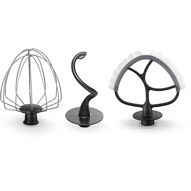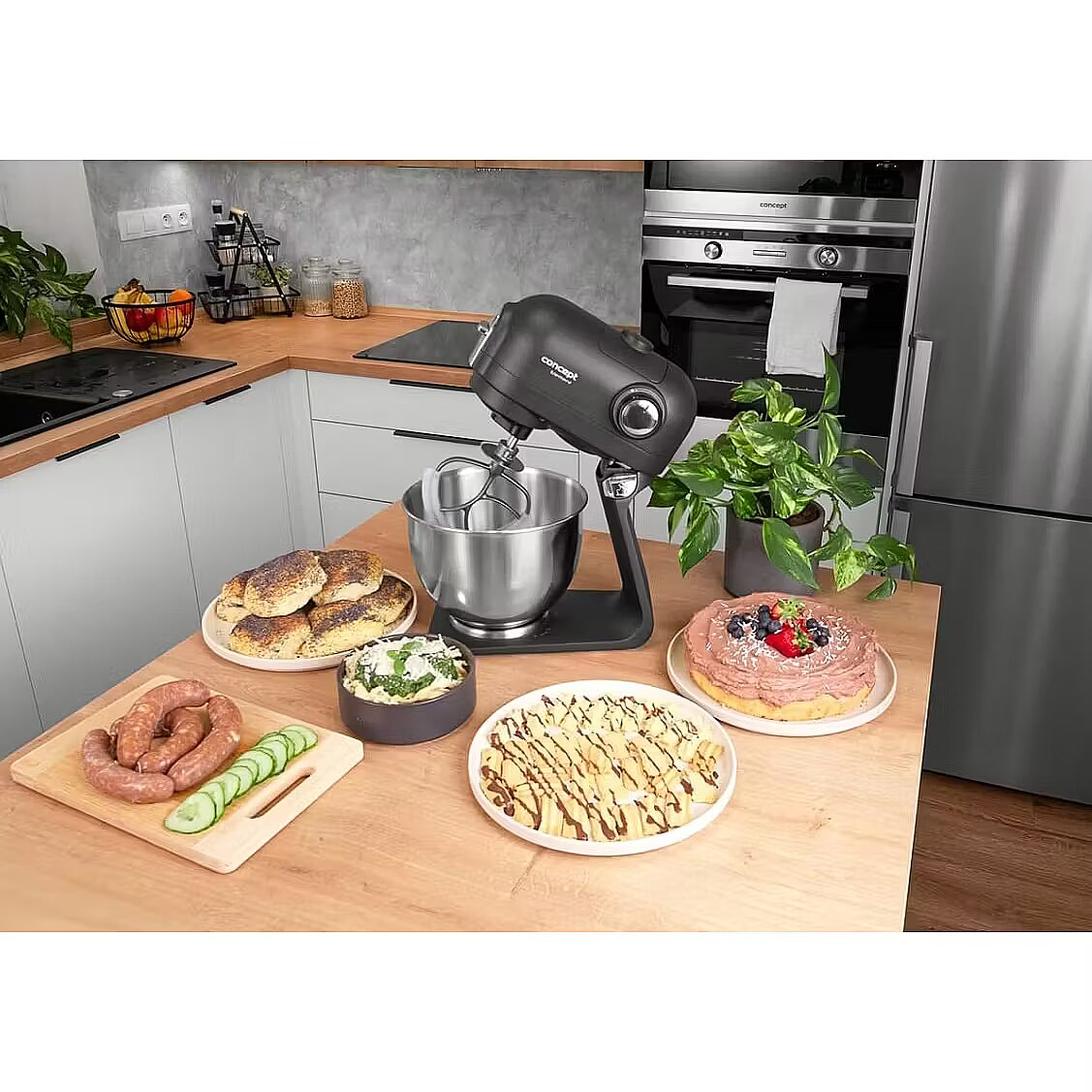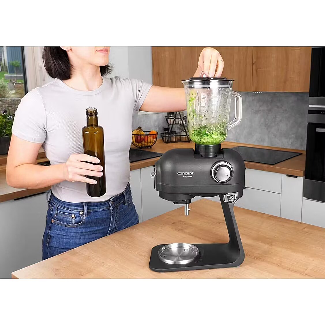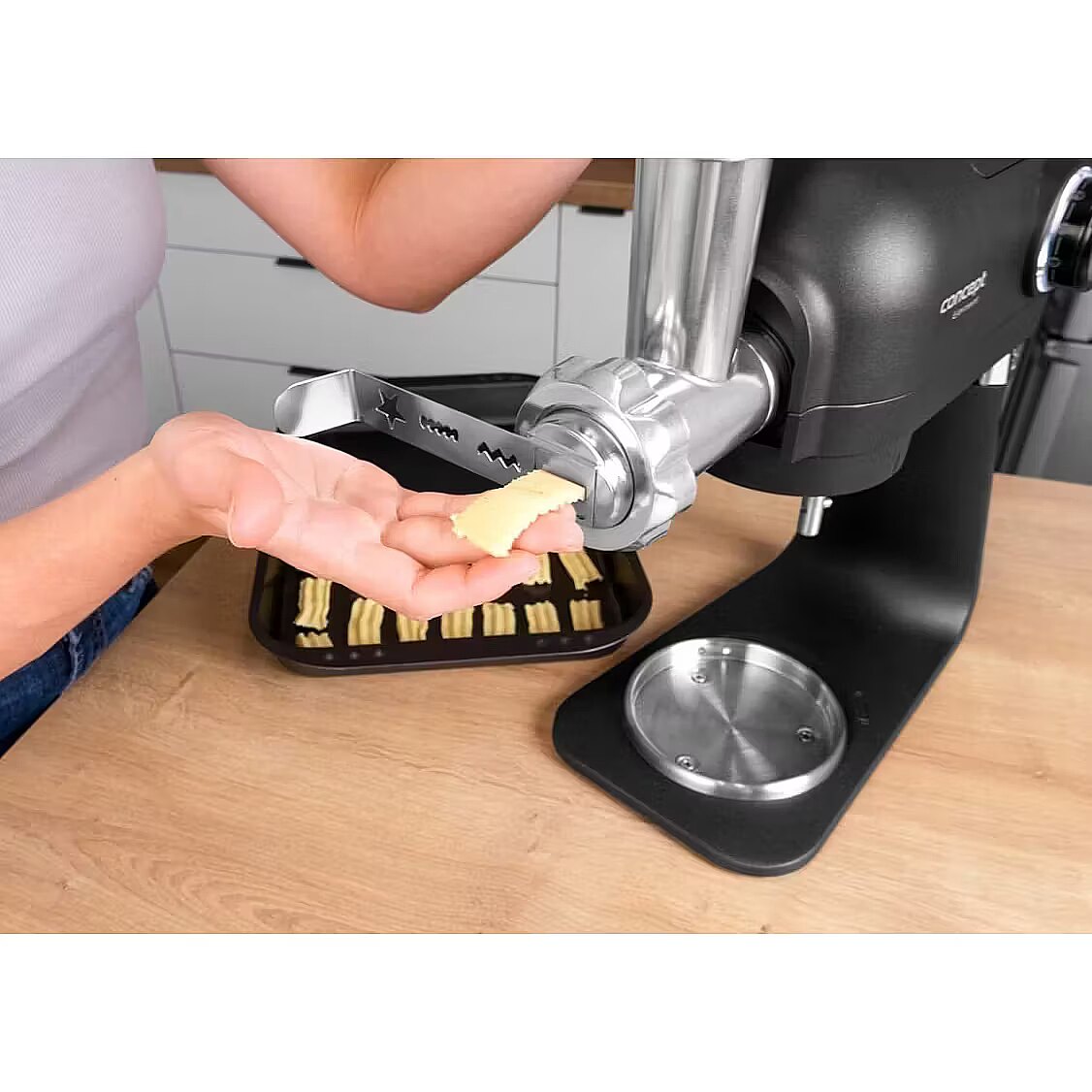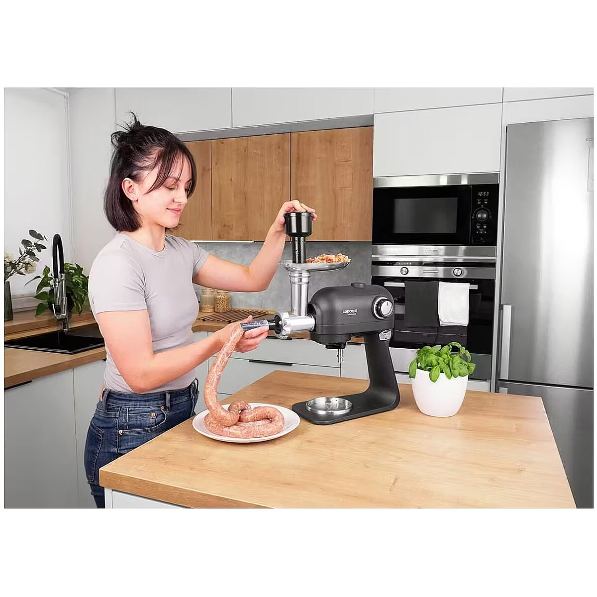Accessories included - 5-litrowa misa ze stali nierdzewnej z uchwytem + pokrywka W pełni metalowe mieszadła: flexi trzepaczka, trzepaczka do ubijania, hak do ciasta Szklany blender o pojemności 1,5 l Maszynka do mięsa (3 wymienne tarcze o różnej grubości mielenia) + przystawki do napełniania parówek i kiełbas + przystawka do formowania ciastek 3 przystawki do makaronu (lasagne, trenette, tagliatelle) Tarka z 5 wymiennymi przystawkami