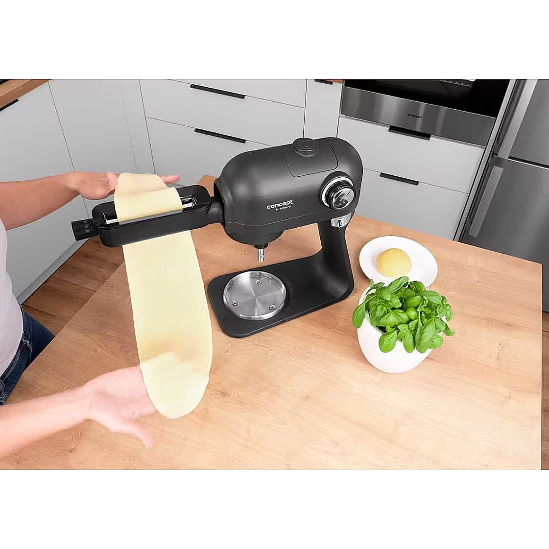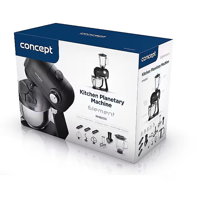 Description - Wielofunkcyjny pomocnik do każdej kuchni Robot kuchenny ELEMENT w eleganckiej czerni to nie tylko stylowy dodatek, ale przede wszystkim niezawodny pomocnik, który oszczędzi Ci mnóstwo pracy. Poradzi sobie z wyrabianiem ciasta, ubijaniem kremów, śmietany i piany z białek, ale na tym nie koniec - potrafi miksować, trzeć, mielić mięso, napełniać parówki i kiełbasy, robić domowe ciasteczka oraz świeży makaron dzięki przystawce pasta maker. A to wszystko w kompaktowej formie, która oszczędza miejsce na blacie i zastępuje kilka osobnych urządzeń. Jedno urządzenie, wiele funkcji, mniej zmartwień. Przemyślane rozwiązanie dla każdej kuchni! W pełni metalowa konstrukcja zwiększa trwałość robota Metalowa obudowa robota kuchennego, wraz z metalowymi przekładniami wewnętrznymi, to gwarancja trwałości i odporności na codzienne użytkowanie. Solidna konstrukcja zapewnia stabilność pracy, minimalizuje wibracje i hałas, co szczególnie docenisz podczas wyrabiania ciasta lub miksowania gęstych składników. Metalowe przekładnie zapewniają płynne, niezawodne działanie bez zbędnego zużycia, co znacząco wydłuża żywotność urządzenia. Dzięki swojej wytrzymałości robot doskonale sprawdza się w wymagających zadaniach kuchennych, oferując profesjonalną wydajność. Pasta maker do domowego makaronu Dzięki specjalnemu zestawowi do makaronu możesz przygotować domowe pasty jak prawdziwy włoski szef kuchni. W zestawie znajdziesz trzy przystawki: pierwsza pozwala rozwałkować gładki arkusz ciasta, idealny na lasagne lub do przygotowania domowych ravioli. Druga przystawka formuje trenette - cienkie płaskie nitki przypominające linguine, doskonałe do pesto lub owoców morza. Trzecia umożliwia tworzenie szerszych tagliatelle, które idealnie komponują się z kremowymi i mięsnymi sosami. Dzięki temu wyposażeniu z łatwością przygotujesz świeży makaron według własnych upodobań, bez zbędnych dodatków. Maszynka do mięsa z przystawką do napełniania parówek i kiełbas Masz ochotę na domowe burgery, ćevapčići albo lasagne? Dzięki wymiennym końcówkom z trzema rozmiarami oczek łatwo przygotujesz mielone mięso dostosowane do konkretnego przepisu. Drobna siatka idealna jest do pasztetów, średnia do kotletów mielonych lub pieczeni rzymskiej, a największe oczka umożliwią przygotowanie farszu do kiełbas, które następnie bez problemu napełnisz dzięki specjalnej przystawce. Miesza, wyrabia, ubija Robot wyposażony jest w przestronną 5-litrową misę ze stali nierdzewnej z praktycznym uchwytem i pokrywką oraz trzy w pełni metalowe mieszadła, które bez problemu poradzą sobie z przygotowaniem kremów, śmietany, piany z białek, majonezu, sosów i ciasta drożdżowego. Flexi trzepaczka z gumową łopatką świetnie nadaje się do lekkich kremów, nadzień i polew - dokładnie przylega do ścian misy i zbiera całą masę bez resztek. Hak do ciasta poradzi sobie nawet z gęstymi ciastami drożdżowymi, a trzepaczka do ubijania nada składnikom lekką, puszystą konsystencję. Dzięki planetarnemu systemowi mieszania mieszadła i hak obracają się nie tylko wokół własnej osi, ale także wokół całej misy, co zapewnia równomierne i dokładne mieszanie składników. Po zakończeniu pracy mieszadła zatrzymują się w idealnej pozycji do ich łatwego wyjęcia - to zasługa systemu Smart Stop Position. Kremowe zupy i orzeźwiające koktajle Robot planetarny RM8000 wyposażony jest w wydajny blender ze szklaną misą o pojemności 1,5 l, w której bez obaw zmiksujesz gorące i zimne składniki. W mgnieniu oka przygotujesz zupy krem, sosy, purée, koktajle oraz orzeźwiające smoothie. Tarka z 5 wymiennymi przystawkami Musisz szybko zetrzeć warzywa na sałatkę, ser do makaronu albo wykorzystać czerstwe pieczywo na bułkę tartą? Z robotem RM8000 zrobisz to w kilka chwil. Wybierz odpowiednią przystawkę i działaj. Urządzenie zaoszczędzi Twój czas i wysiłek nie tylko przy tarciu, ale również krojeniu. Niezależnie od tego, czy chcesz uzyskać cienkie plasterki czy grubsze kawałki - zawsze osiągniesz idealny efekt. Specjalna przystawka do placków ziemniaczanych świetnie sprawdzi się do delikatnie startych ziemniaków. Z jej pomocą szybko przygotujesz składniki na sałatki, dodatki albo domowe chipsy. Z robotem RM8000 wszystko gotowe w kilka minut. Formeka do ciastek Robot kuchenny RM8000 wyposażony jest w przystawkę do formowania ciastek, która posiada 4 różne otwory. Dzięki niej szybko i wygodnie przygotujesz domowe herbatniki lub świąteczne ciasteczka w różnych kształtach i smakach. Wydajność, bezpieczeństwo i łatwa konserwacja w jednym Robot oferuje pięć poziomów prędkości oraz praktyczną funkcję PULSE, która zapewnia maksymalną moc w kilka sekund - dokładnie wtedy, gdy jej potrzebujesz. Mocny silnik o mocy 1200 W z łatwością radzi sobie nawet z ciężkimi ciastami. O bezpieczeństwo dba blokada, która uniemożliwia uruchomienie robota, jeśli nie został prawidłowo złożony. Konserwacja jest prosta - wystarczy przetrzeć urządzenie wilgotną ściereczką, mieszadła i misę można myć w zmywarce, a pozostałe części umyć w ciepłej wodzie z detergentem i dokładnie osuszyć.